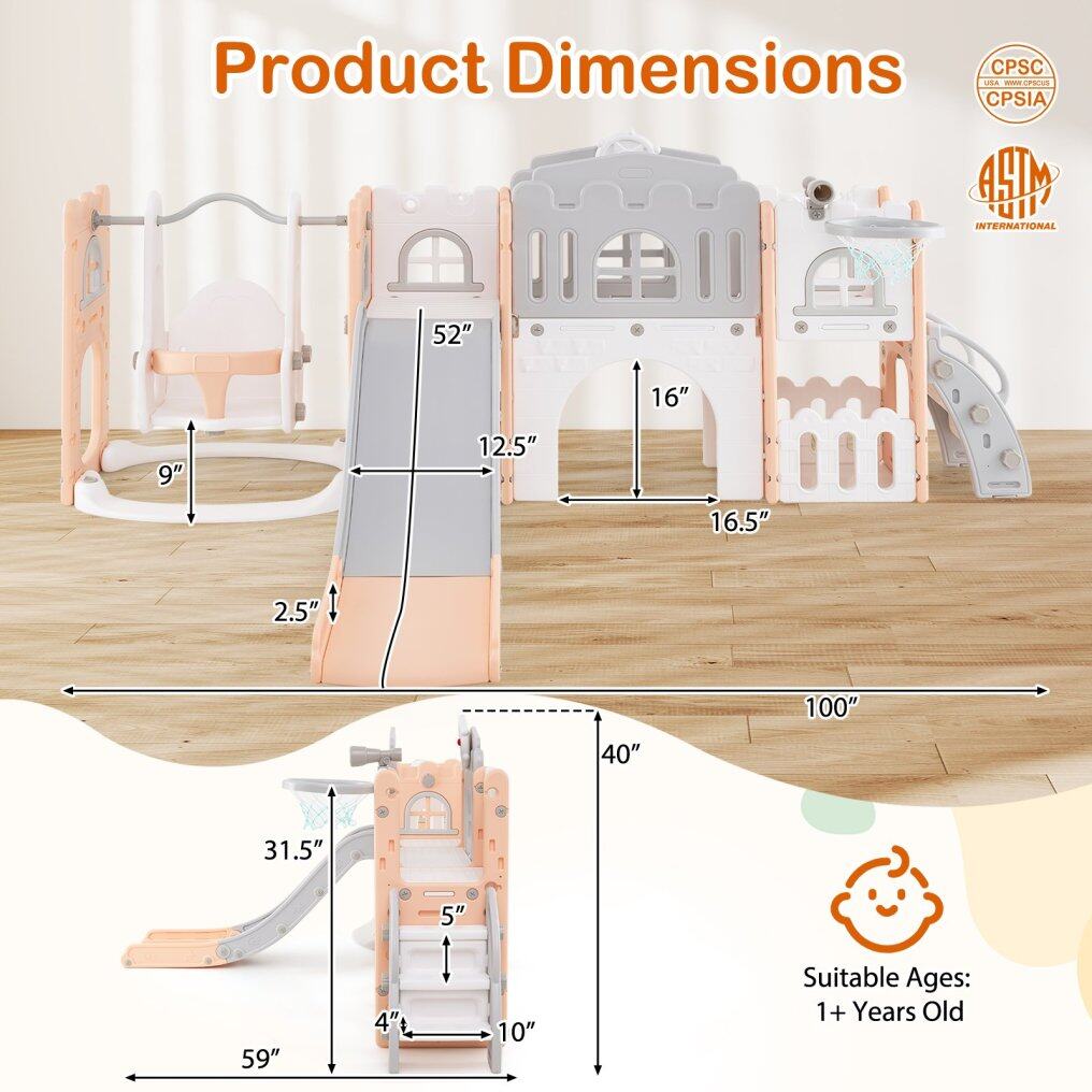 Multi-Activity Playset: The toddler slide consists of the swing, slide, storage space, steering wheel, peek-a-boo window, aisle, crawling tunnel, telescope, climber, and basketball hoop. Coming with a basketball and inflator, the slide for kids is designed to engage your children for hours of fun.