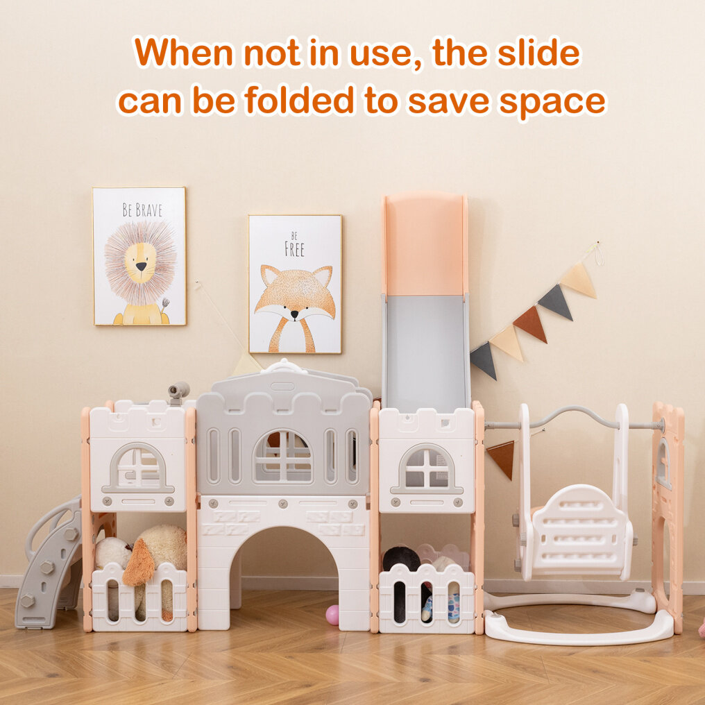 Fun and Foldable Slide: Featuring raised handrails on both sides, the slide is divided into a waiting area, acceleration area, deceleration area, and buffering area for a secure yet exciting sliding experience. Moreover, you can fold up the slide for space-saving storage when this indoor playground is not in use.
