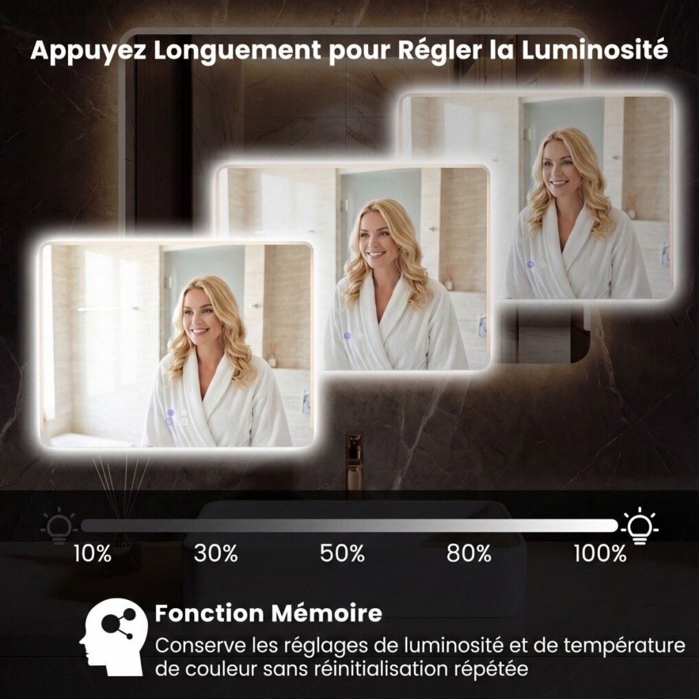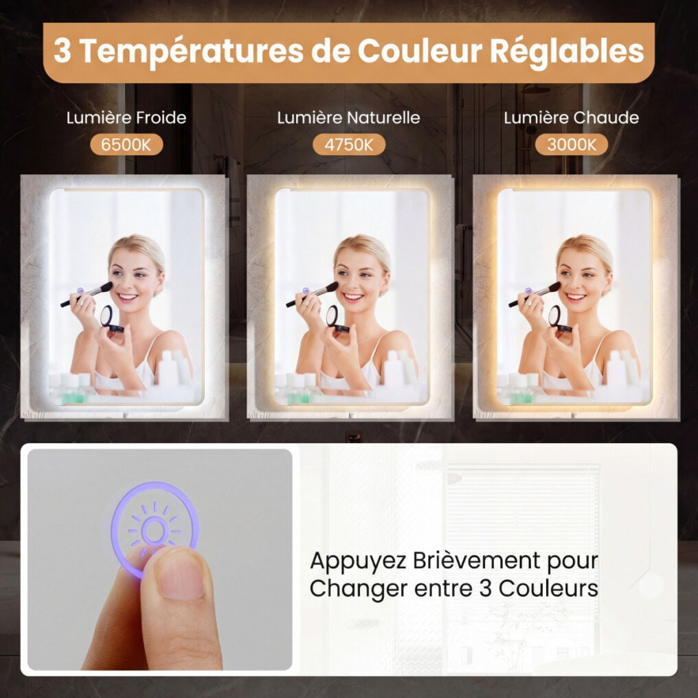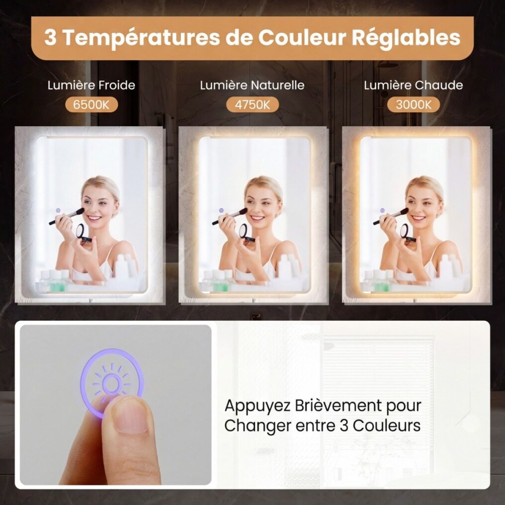 【Customizable Lighting Experience】This LED bathroom mirror features a stepless dimmer with 3 adjustable color temperatures: cool light, natural light, and warm light. Additionally, the memory function ensures your preferred settings are easily recalled each time you use it.