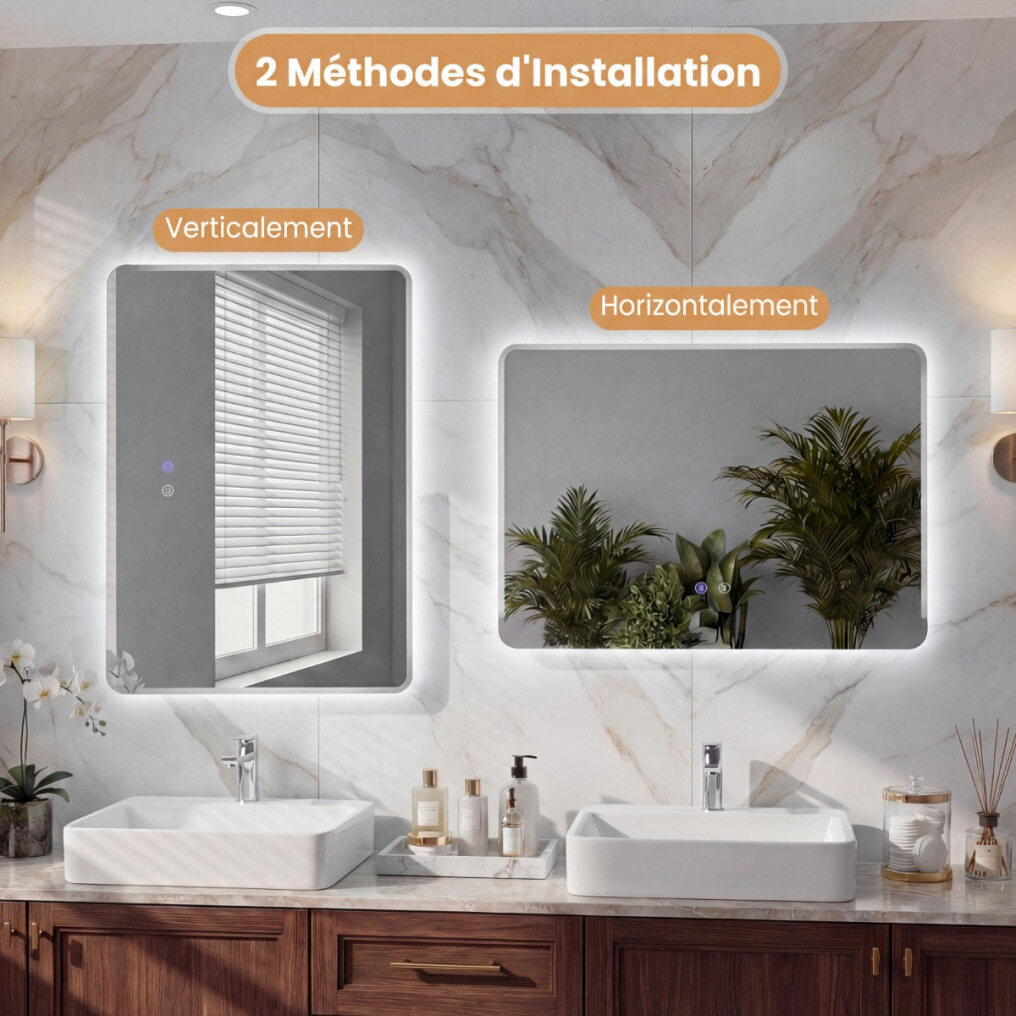 【Easy & Flexible Installation】This illuminated mirror can be installed vertically or horizontally using the 4 sturdy metal hooks, as well as the included wall plugs and screws. The wired connection to a wall switch ensures a simple and functional installation.