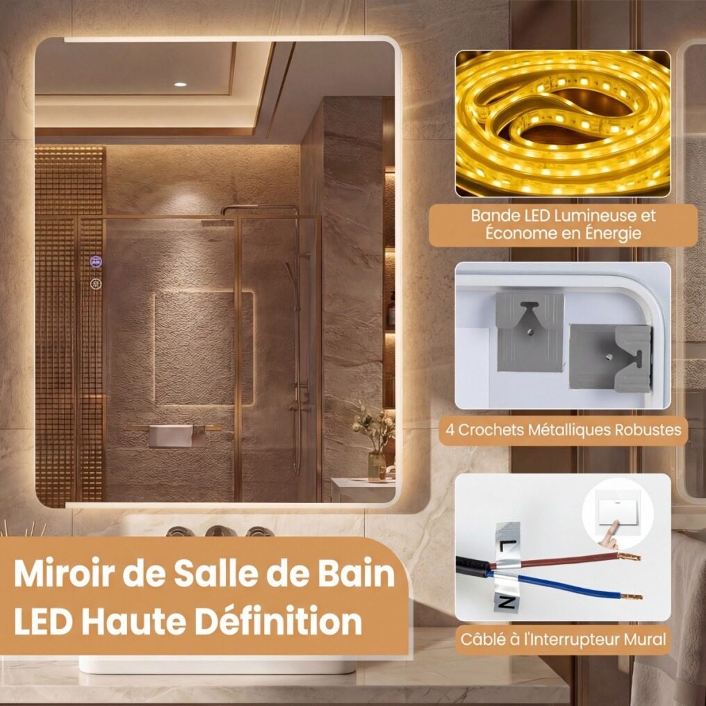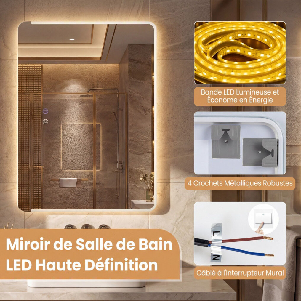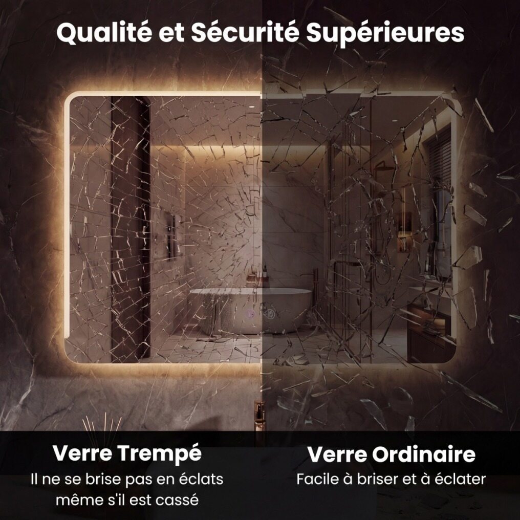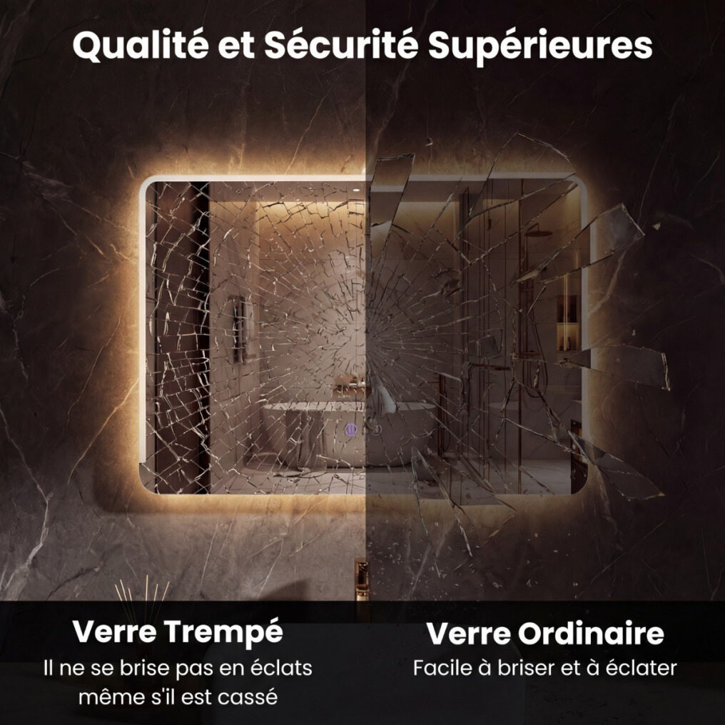 【Superior Quality & Safety】Made of tempered glass with an anti-explosion film, this high-definition LED bathroom mirror not only ensures a flawless reflection, but also offers exceptional safety and durability.