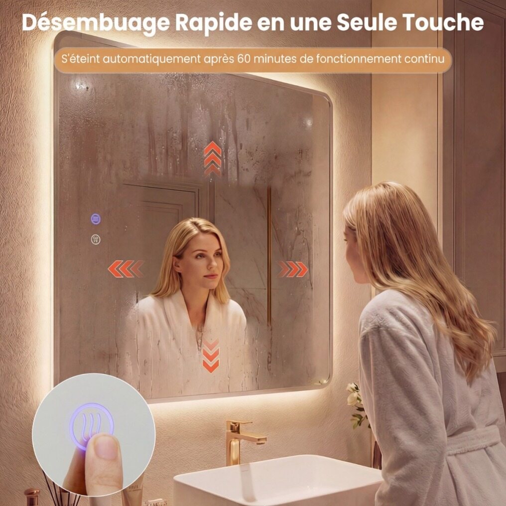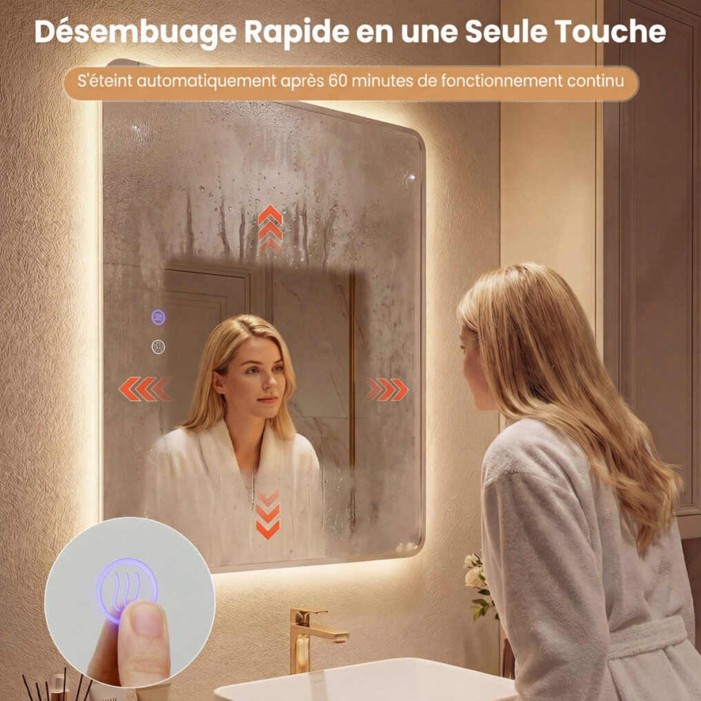 【Anti-Fog for Consistent Clarity】Featuring a quick-activated anti-fog function with a simple press, this backlit makeup mirror is perfect for getting ready after a hot shower. It automatically shuts off after 60 minutes of continuous use.