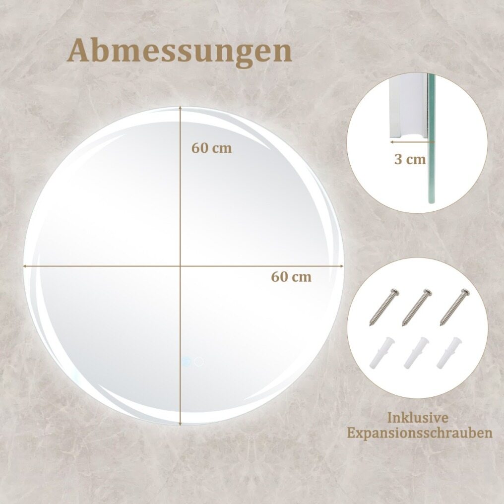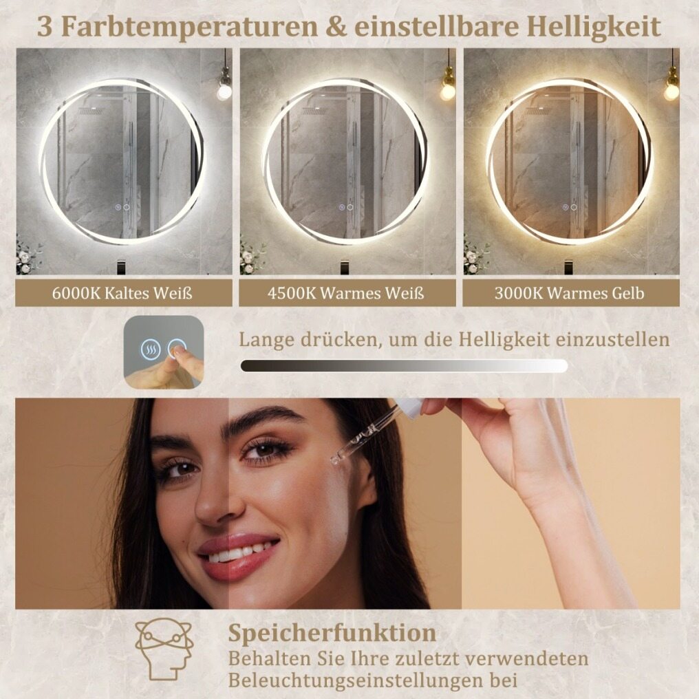 3 Color Temperatures & Adjustable Brightness: This LED bathroom mirror offers adjustable color temperatures (warm yellow 3000K, warm white 4500K, cool white 6000K) and seamlessly adjustable brightness. The built-in memory function retains the last used lighting settings.
