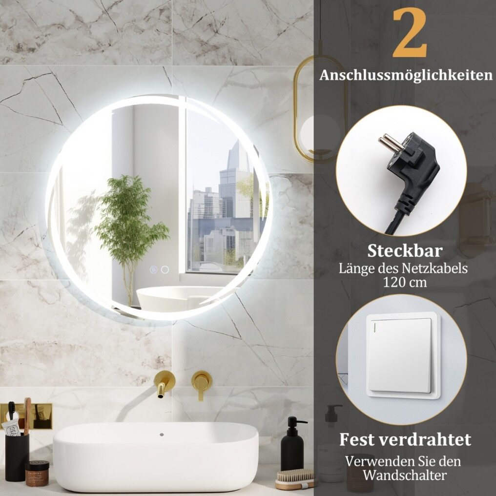 Flexible Installation Options: The vanity mirror comes with pre-assembled wall mounting hooks and expansion screws. The mirror is available in 2 connection options: choose between plug-in installation (power cord length 120cm) or hardwired (using the wall switch).