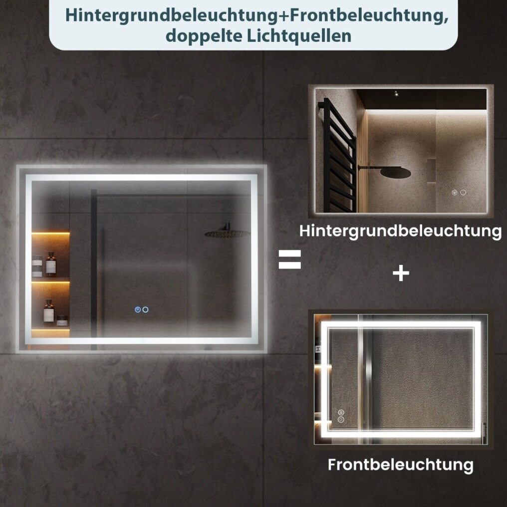 Backlit & Front Light, Dual Light Sources: This lighted mirror offers a dual lighting system, with both backlit and frontlit settings. This feature allows the light to come not only from the front for clarity, but also softly from behind, creating a pleasant atmosphere.