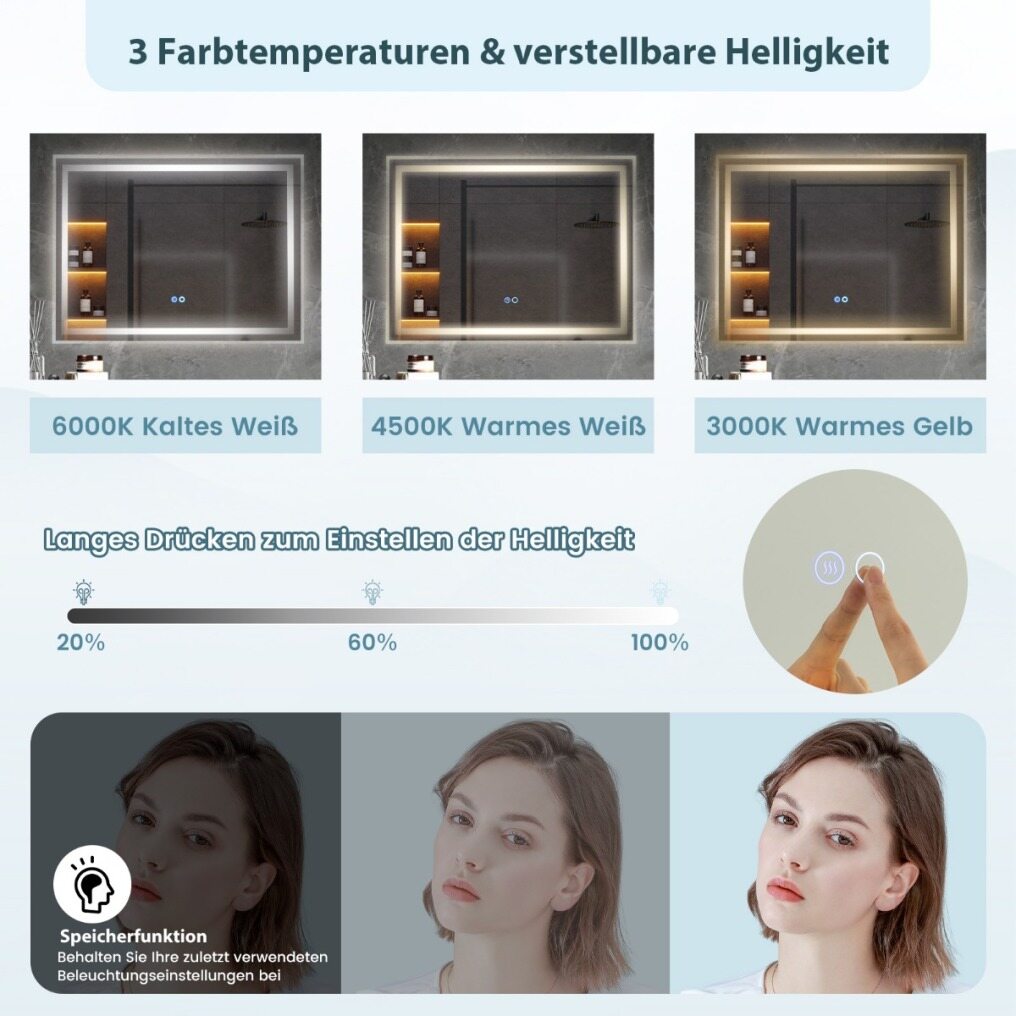 3 Color Temperatures & Adjustable Brightness: This LED bathroom mirror offers adjustable color temperatures (warm yellow 3000K, warm white 4500K, cool white 6000K) and fully adjustable brightness. The built-in memory function retains the last lighting setting used.