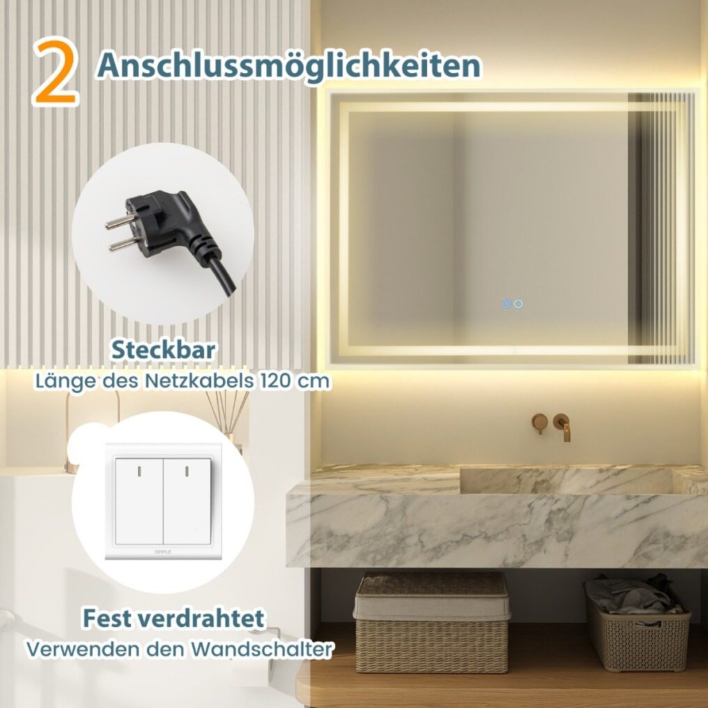 Flexible Installation Options: The led wall mirror comes with pre-assembled wall mounting hooks and expansion screws. There are 2 connection options: choose between plug installation (power cord length 120cm) or wired installation (with wall switch).