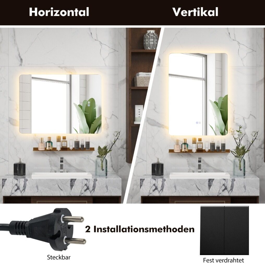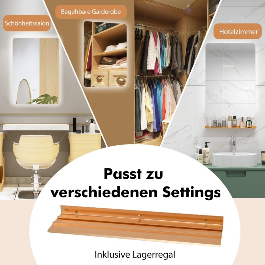 Featuring stepless dimming and 3 different light colors, you can effortlessly create the perfect lighting and ambiance with a simple touch and restore them with the memory function. A press on the auto-defrost function ensures uninterrupted use. With its versatile mounting options and an included metal shelf, our vanity mirror with lights is an ideal addition to your modern bathroom space, walk-in closet, or commercial environments such as beauty salons or hotels.