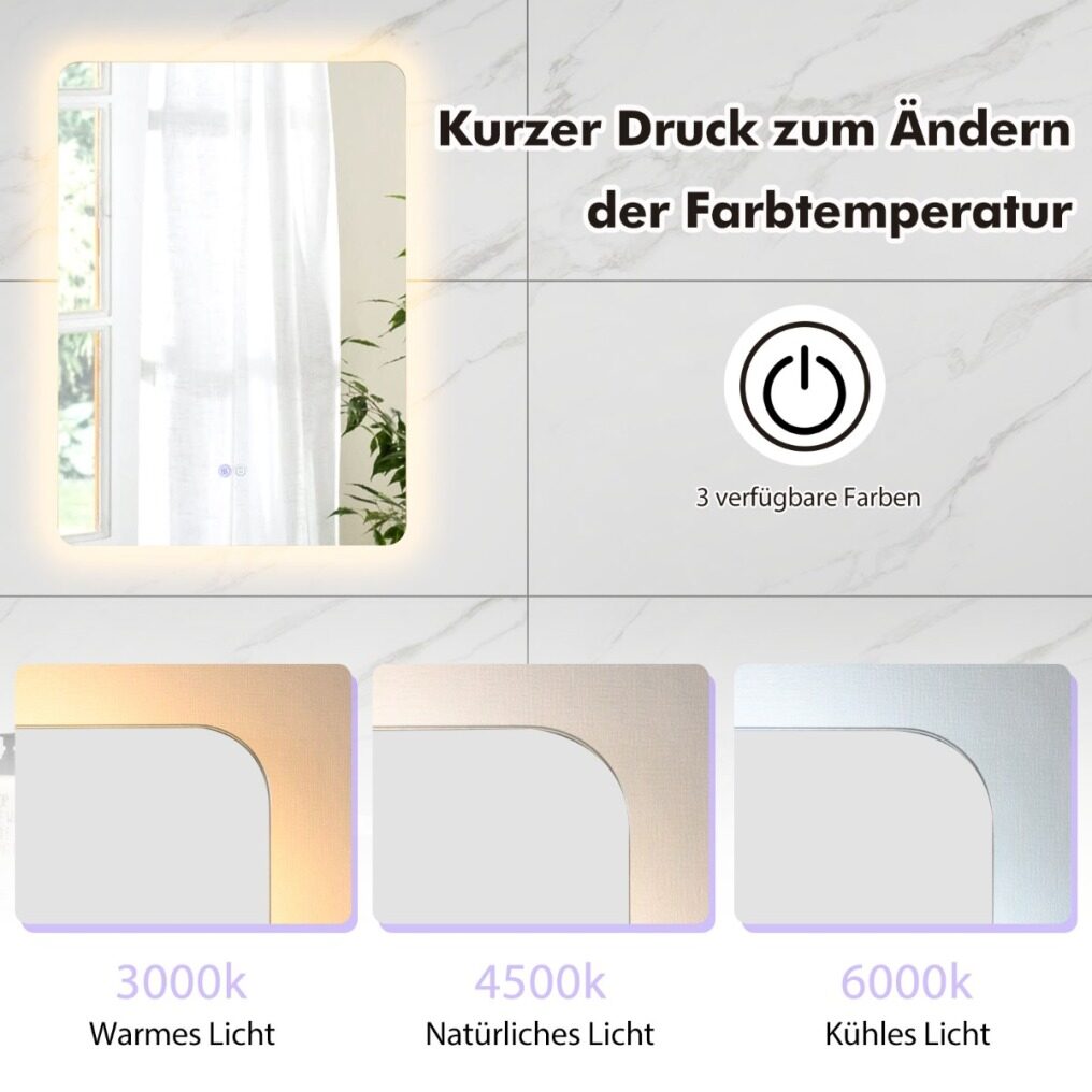 Adjustable Brightness & 3 Colors: Our LED bathroom mirror features stepless dimming and 3 light colors available. Choose between warm (3000K), natural (4500K) and white (6000K) with a short touch, and long press to adjust the brightness from 100% to 10% to meet various makeup needs.