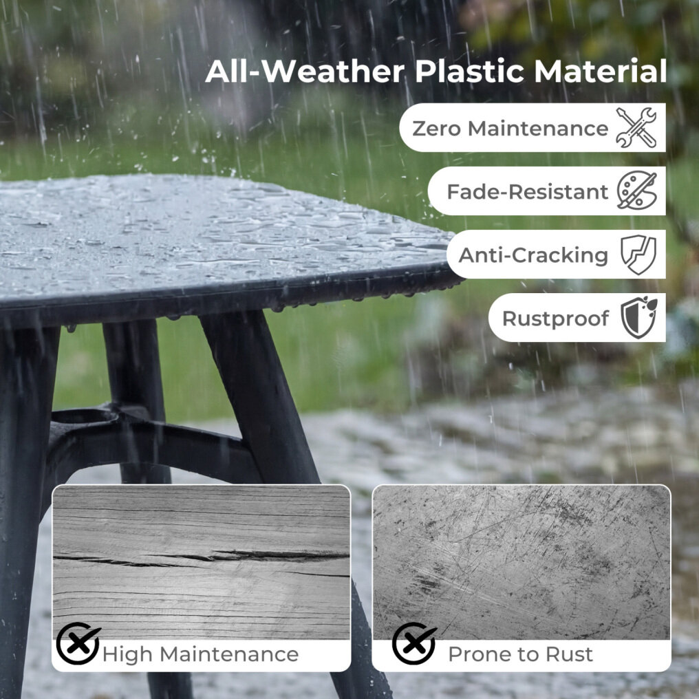 ● All-Season Durability: Crafted from weather-resistant plastic, this small square patio table is built to withstand the elements year-round. It effectively resists fading and cracking. Unlike metal options, this rust-proof piece ensures long-lasting durability.