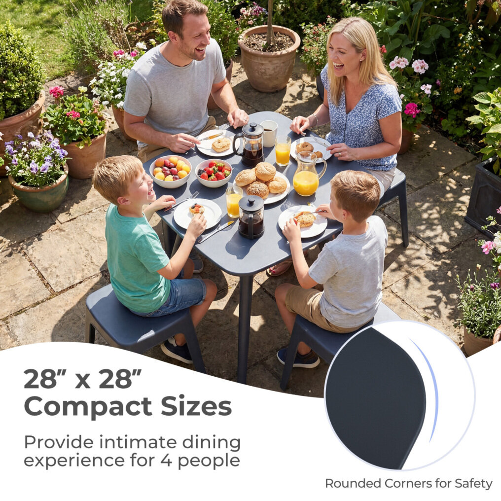 ● Compact Intimate Dining Size: Measuring exactly 28 inches square, the solid top outside table offers an intimate dining setting for 4 people. Its modern minimalist design fits effortlessly into small balconies and porches.