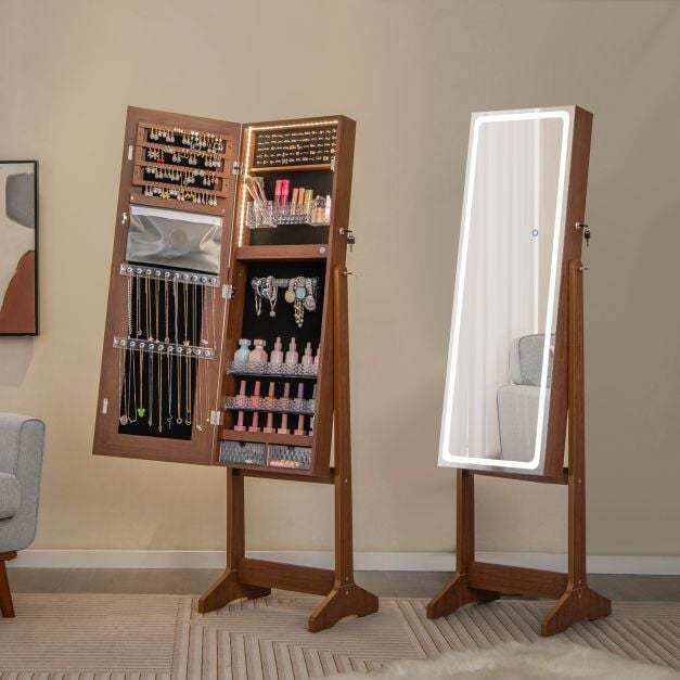 Equipped with 72 earring slots, 24 earring stud holes, 20 necklace hooks, 65 ring slots, 1 zippered plastic bag and 1 bracelet rod, this jewelry cabinet can organize all your jewelry properly. Plus, the lipstick tray, 2 shelves and 2 drawers that are all made from acrylic offer extra storage space for your makeup, skin care products, etc. To keep your belongings well protected, the jewelry armoire adopts a lockable door and soft velvet lining inside. More importantly, the touch screen full-length mirror with 3-color LED lighting can bring light to your room, while the built-in 3-color LED lights make it easier for you to choose the jewelry in the dark. Besides, there are 3 holes on each side of the stand, allowing you to adjust the tilt angle of the jewelry cabinet to get a better view.
