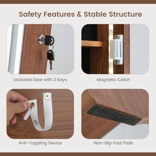 Well-made and Thoughtful Design: Equipped with a lockable door with keys, the mirrored jewelry cabinet keeps every piece of your jewelry safe. Moreover, the back anti-tipping strap, reinforced base and anti-slip foot pads at the bottom ensure high stability and security.