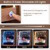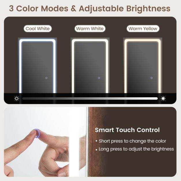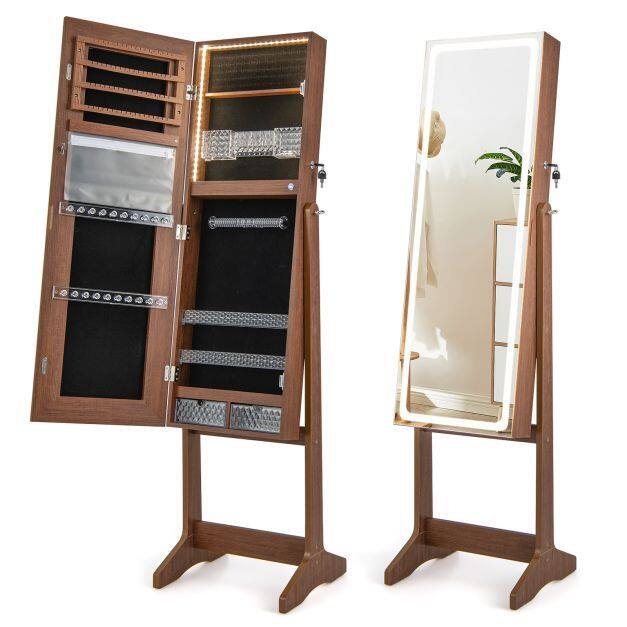 External and Internal LED Lights: The standing jewelry armoire features a lighted external full-screen mirror, which has 3 color temperature options: cool white, warm white, warm yellow. Plus, the built-in dimmable LED strip also has 3 colors of lights for you to choose: blue, blue and white mix, yellow. And you can long press the button to adjust the brightness. Note: please connect the included power adapter before using.