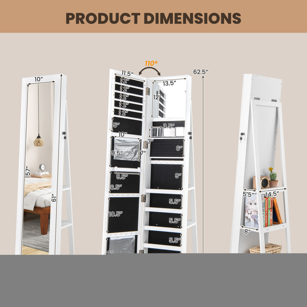 3-in-1 Functional Design: The 3-in-1 jewelry organizer combines a full length mirror, a jewelry cabinet, and 3 back storage shelves, providing all-round functionality for you. The full length mirror reflects your image from head to toe, bringing you much dressing up fun.