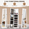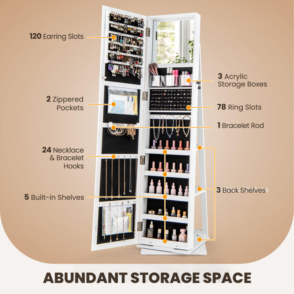 This multifunctional jewelry organizer features a full-length mirror for a head-to-toe outfit check. The interior makeup mirror ensures clear reflection. The jewelry cabinet has 120 earring slots, 1 bracelet rod, 2 zippered pockets, 24 necklace and bracelet hooks, 3 acrylic storage boxes, 78 ring slots, 5 built-in shelves to store your jewelry and cosmetics. 3 back shelves can be used for displaying books, potted plants, or other items. Moreover, 360-degree swivel function enables you to easily turn the mirror back. The jewelry organizer is also designed with a safety lock, cut-out handle, soft velvet lining, and magnetic catch for safe and convenient use.