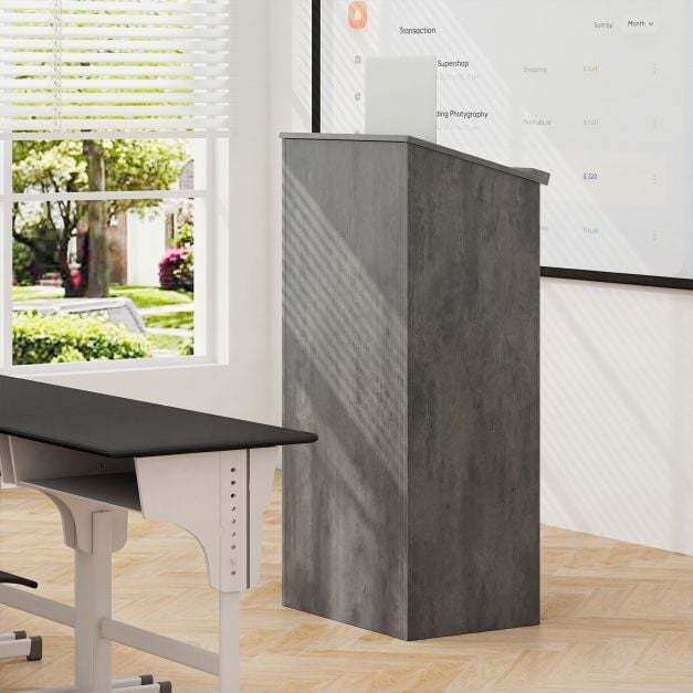 With its angled tabletop, this lectern allows speakers easy access to their notes or documents while effortlessly delivering their message. The ergonomic design ensures a natural and relaxed posture to reduce strain. Featuring a spacious storage compartment, this lectern provides ample room for books and presentation aids. Furthermore, the improved design of this talking lectern includes cable management holes for simple and discreet cable management. This lectern is a versatile and functional addition to any speaking setting, including classrooms, conference rooms, restaurants, churches, and seminar rooms.