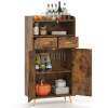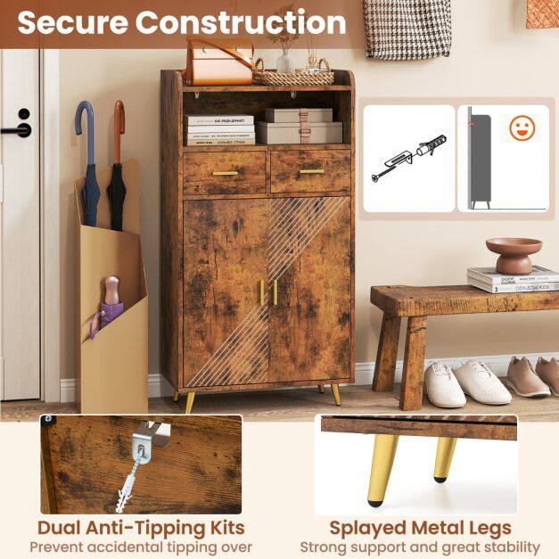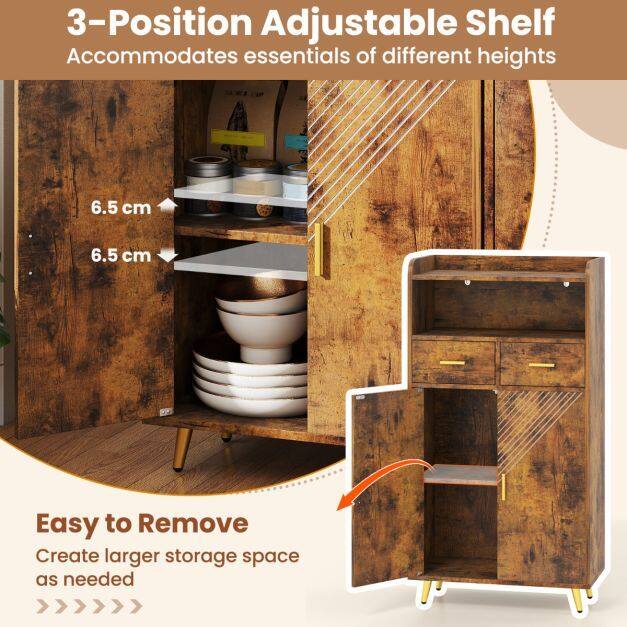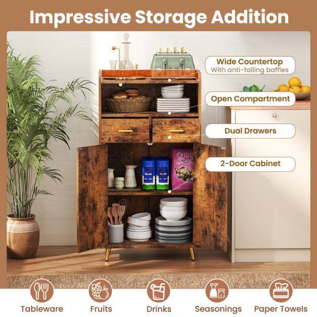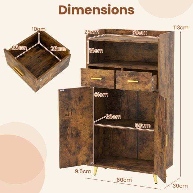 Its strong metal legs ensure durability and stability. Moreover, this sideboard buffet cabinet features a wide countertop, an open compartment, 2 drawers and a 2-door cabinet, optimized for storage as a kitchen storage cupboard or pantry cabinet. The interior features a 3-level adjustable shelf, providing flexible storage solutions for items big and small. For added safety and peace of mind, this freestanding storage cabinet is equipped with anti-toppling devices and drawer stoppers.
