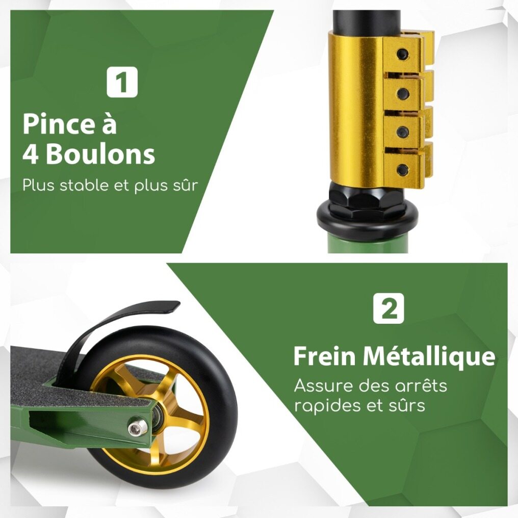 Safe Riding Experience: The 360° rotatable powder-coated metal handlebar plus anti-slip & comfortable TPR grips promotes better control and security. In addition, the solid metal brake on the rear of the trick scooter ensures fast and safe stops.