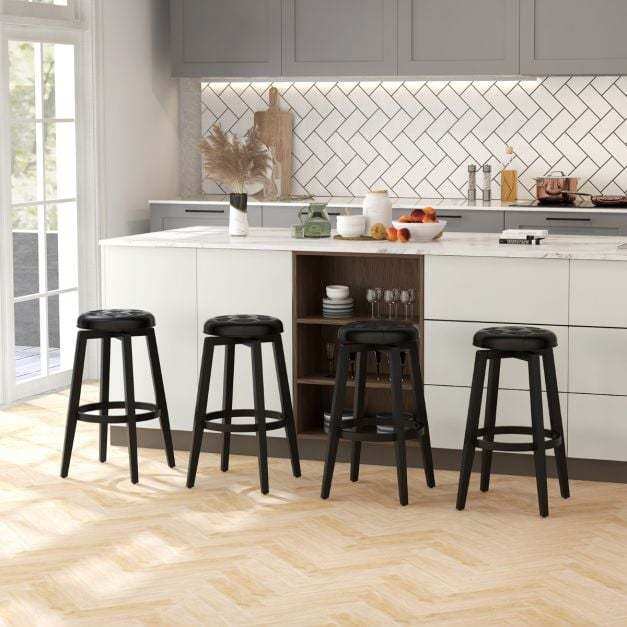 This 4-piece set of stools is equipped with swivel turntables for 360° freedom of rotation. Whether you want to chat with friends or easily access items around the bar, our bar stools will provide convenience. The upholstered seats are made of soft sponge for ultimate comfort. The ergonomic footrest ensures that you maintain the most comfortable position for long periods of time. The rubberwood frame gives the stool long-term durability and stability. More details of the bar stools showcase the finer workmanship, such as the design of decorative tufted buttons bringing aesthetic appeal to the stools. The vintage color scheme and elegant design make this bar stool set perfect for a variety of indoor scenarios, including kitchens, living rooms, bars and restaurants. If you are looking for such a product, do not hesitate to buy it!