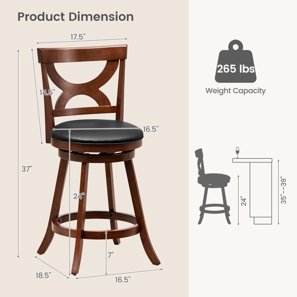 ● Selected Material: Built to last, our swivel bar chair is made with a solid rubber wood frame, ensuring durability and stability. The wear-resistant PVC leather is skin-friendly and also ensures the stool with long lifespan.
