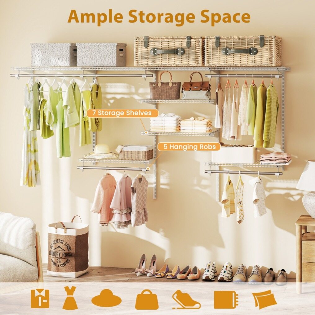 【Plenty of Storage Space】The shelving rail system is equipped with 7 storage shelves and 5 rods, providing up to 380 cm of hanging space and 548 cm of shelf space. Greatly increases storage space for clothes, bags, hats, cushions and other items.