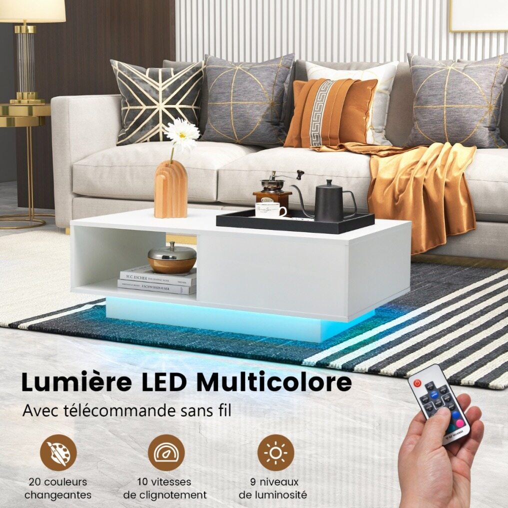 This coffee table brings a romantic atmosphere to your living room. You can choose from 20 different colors of LED lights using the remote control. In addition, there are 5 brightness modes and 5 flashing modes to choose from. The spacious tabletop with open shelves and drawers can meet your storage needs for different items. You don't have to worry about the quality either. This coffee table is made of sturdy MDF for a long service life. The high-gloss finish makes our coffee table look more shiny and attractive. You can place this practical and elegant coffee table in your living room, bedroom, study, etc.