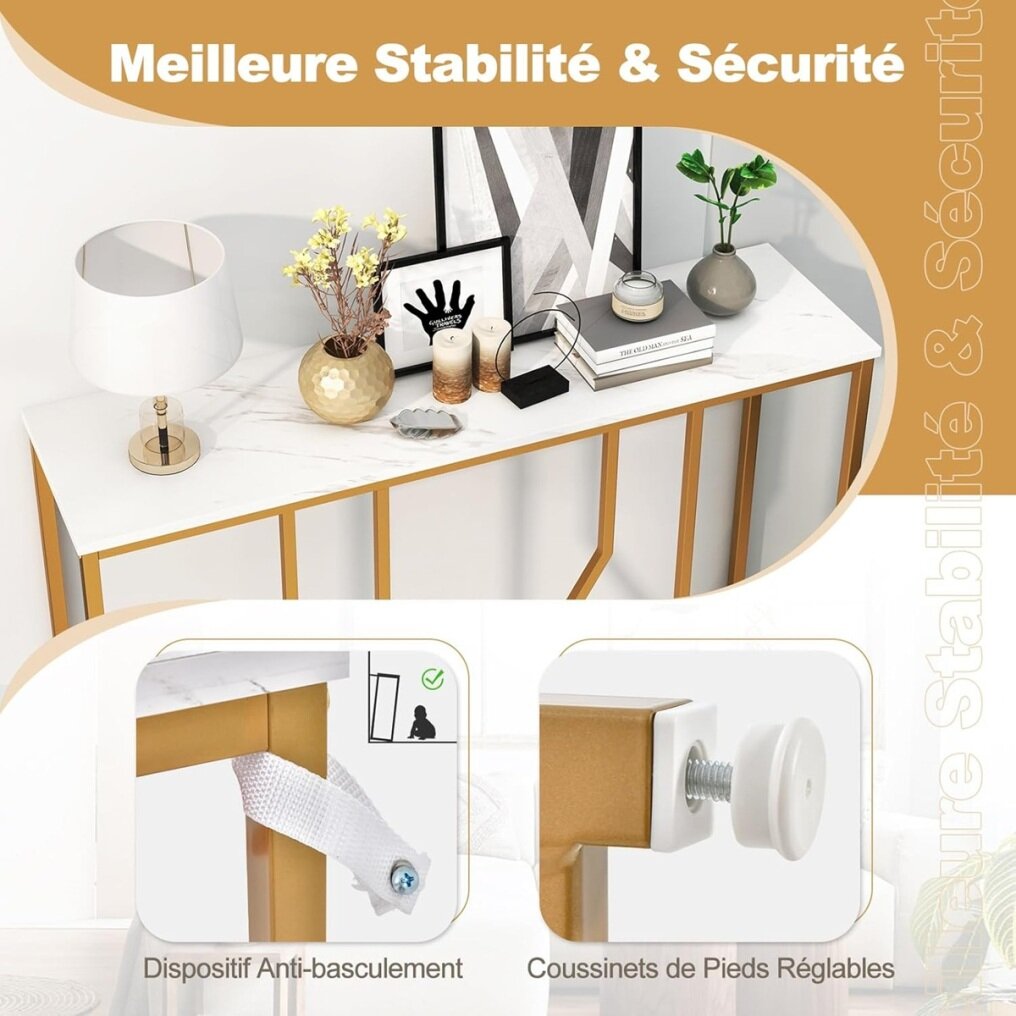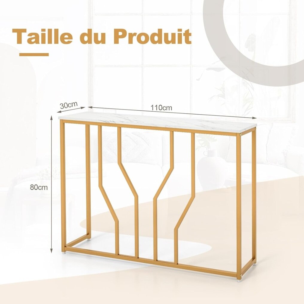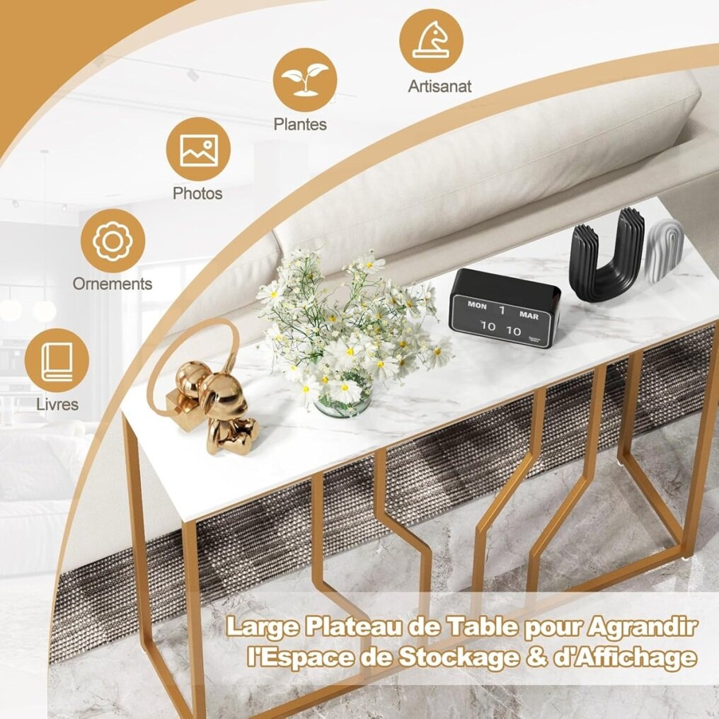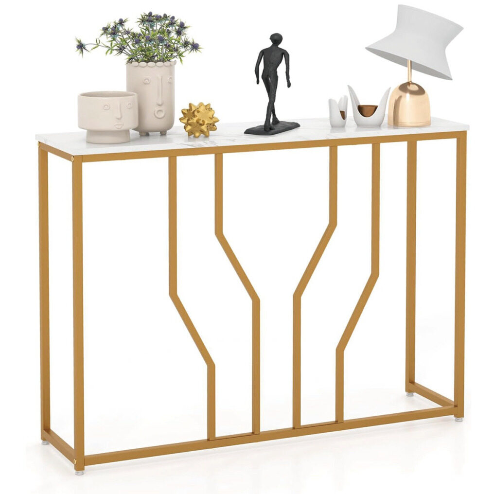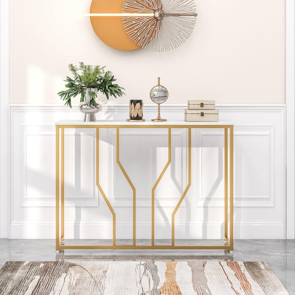 Looking for a sophisticated and functional entryway table? Perfectly combining a textured white faux marble finish and a geometric gold metal frame, this luxurious contemporary entryway table will bring a more elegant glamour to your home. The wide tabletop provides ample space for storing and displaying various items. The sturdy metal construction with anti-tip device ensures good stability and safety. There is no doubt that this table will be an ideal addition to your home.