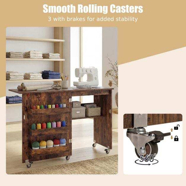 The sewing table features a generous surface that folds away when not in use, saving valuable space in your home or studio. Beneath the main workspace, you'll find a convenient storage shelf and 3 hidden bins, providing ample space to neatly store sewing tools. This mobile craft station is equipped with locking casters, allowing you to easily move your workspace where it's needed, then secure it in place for stability during use. Additionally, the sturdy structure supports your sewing accessories, providing a reliable platform.
