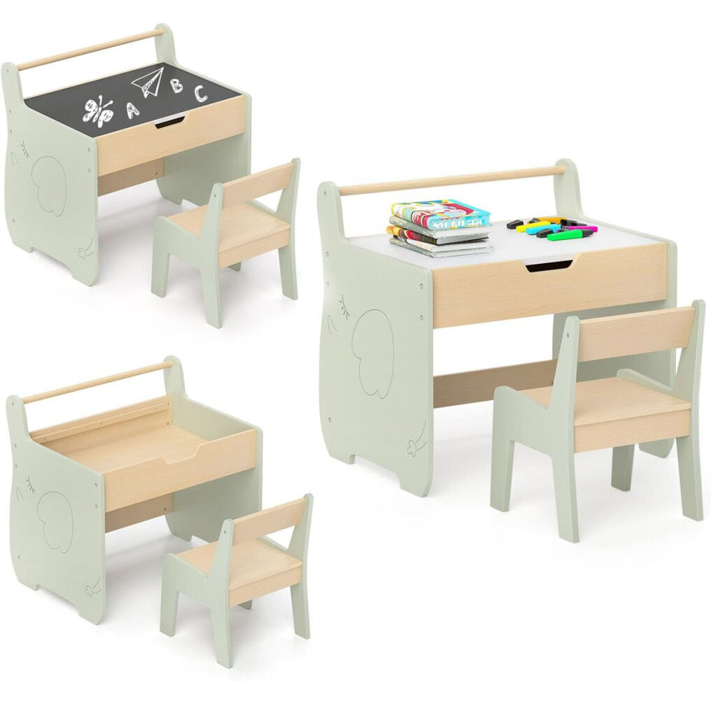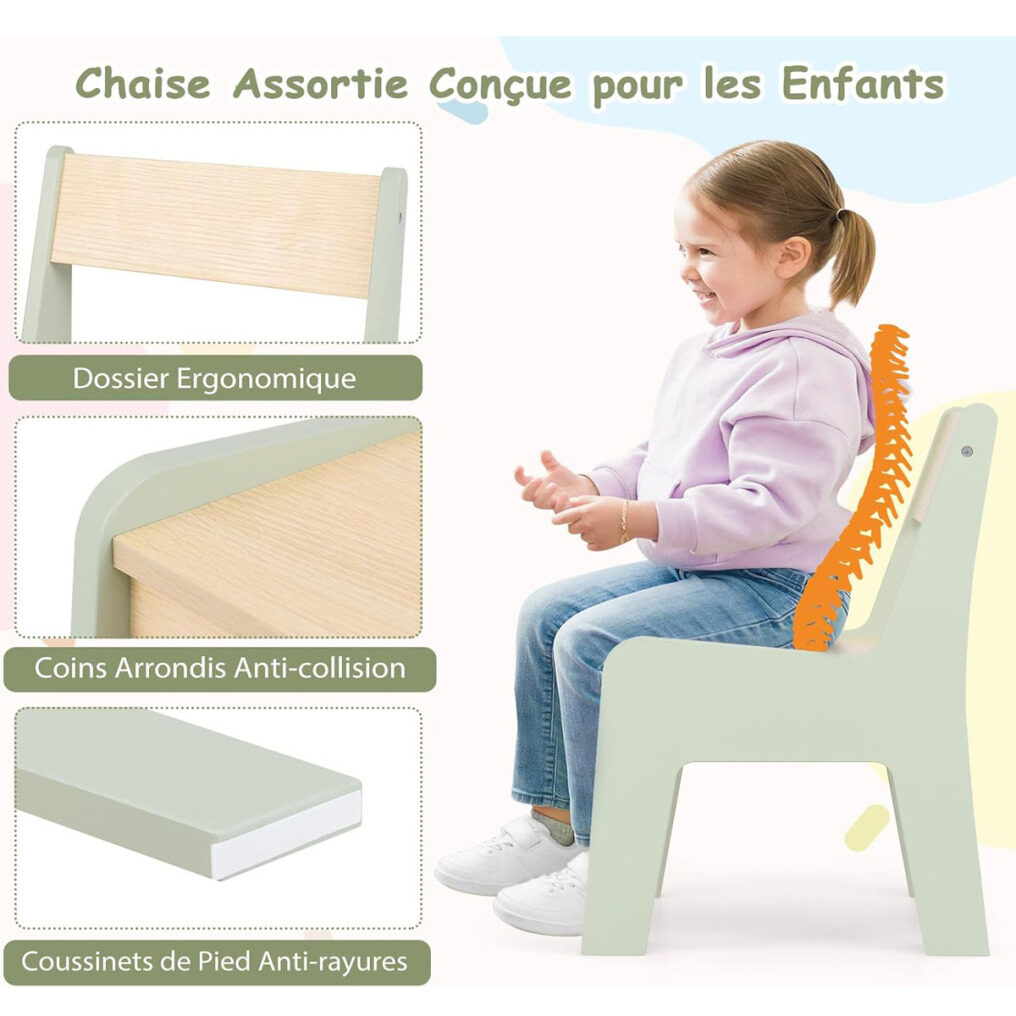 This children's table and chair set offers a perfect blend of functionality and attractive design. The table's 3-in-1 design offers great versatility, allowing children to explore their creativity and have fun with interchangeable chalkboards and whiteboards. The spacious storage space and practical paper roll holder ensure efficient and convenient organization. With its cute and fresh design, this set adds a touch of nature and fun to children's rooms.