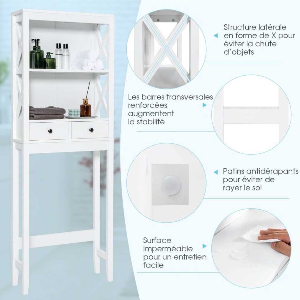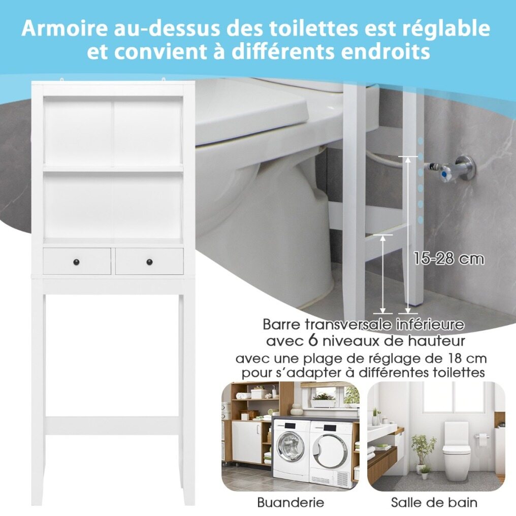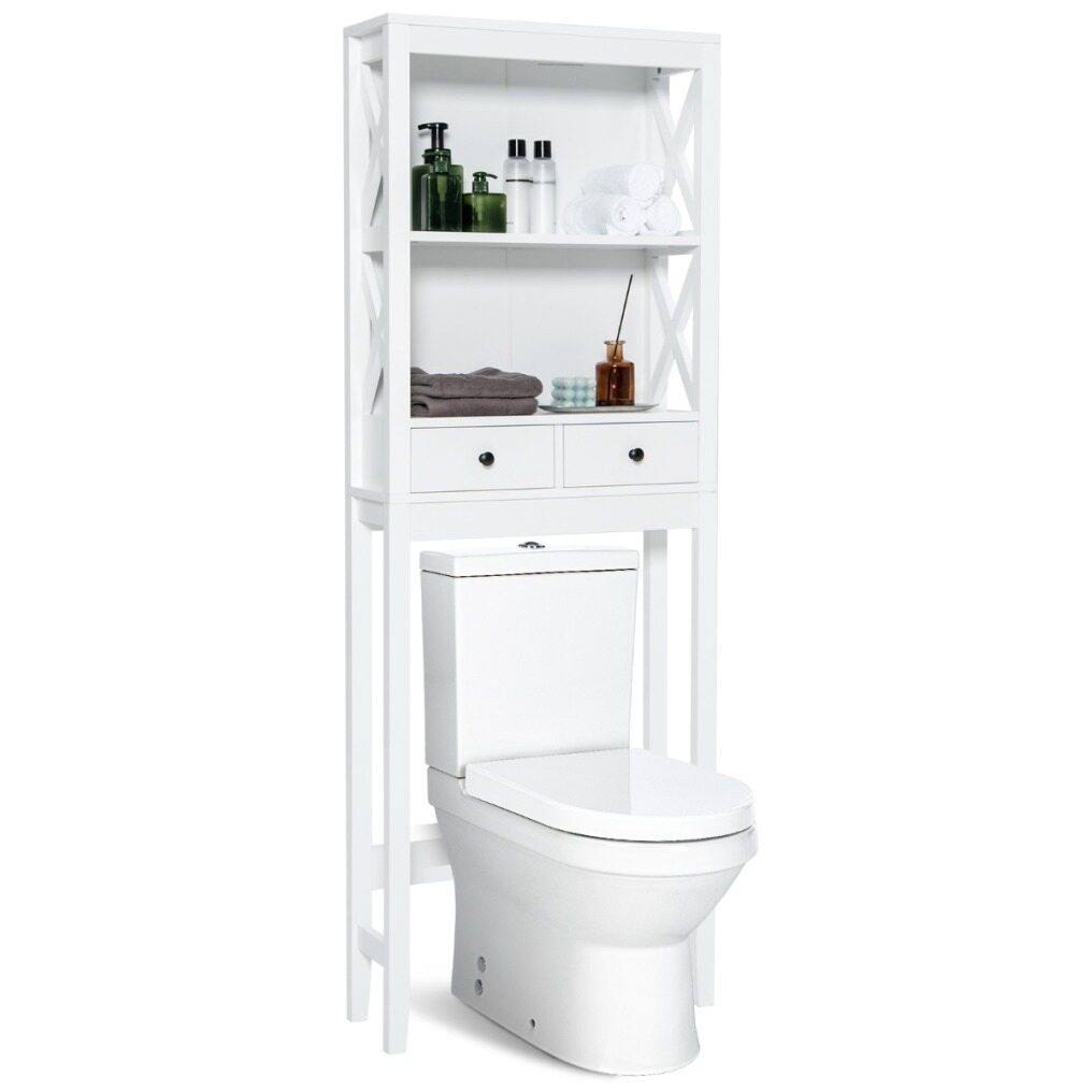 Transform the unused space above your toilet into practical storage with this freestanding bathroom shelf! Featuring three open shelves for quick access and two drawers for discreet storage, this over-the-toilet storage unit offers a thoughtful combination of display and organization options. Equipped with two anti-tip devices, this tall shelf ensures safety and stability during installation. The adjustable bottom bar, with five positions, allows for easy adaptation to water inlet pipes of varying heights, ensuring compatibility with most standard toilets.