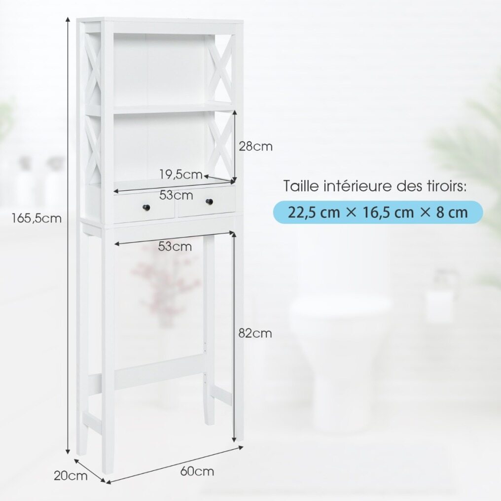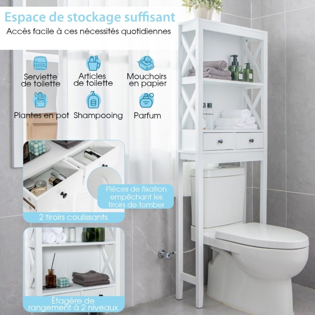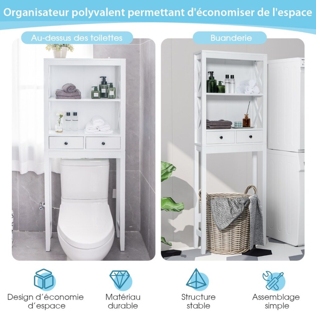 Transform the unused space above your toilet into practical storage with this freestanding bathroom shelf! Featuring three open shelves for quick access and two drawers for discreet storage, this over-the-toilet storage unit offers a thoughtful combination of display and organization options. Equipped with two anti-tip devices, this tall shelf ensures safety and stability during installation. The adjustable bottom bar, with five positions, allows for easy adaptation to water inlet pipes of varying heights, ensuring compatibility with most standard toilets.