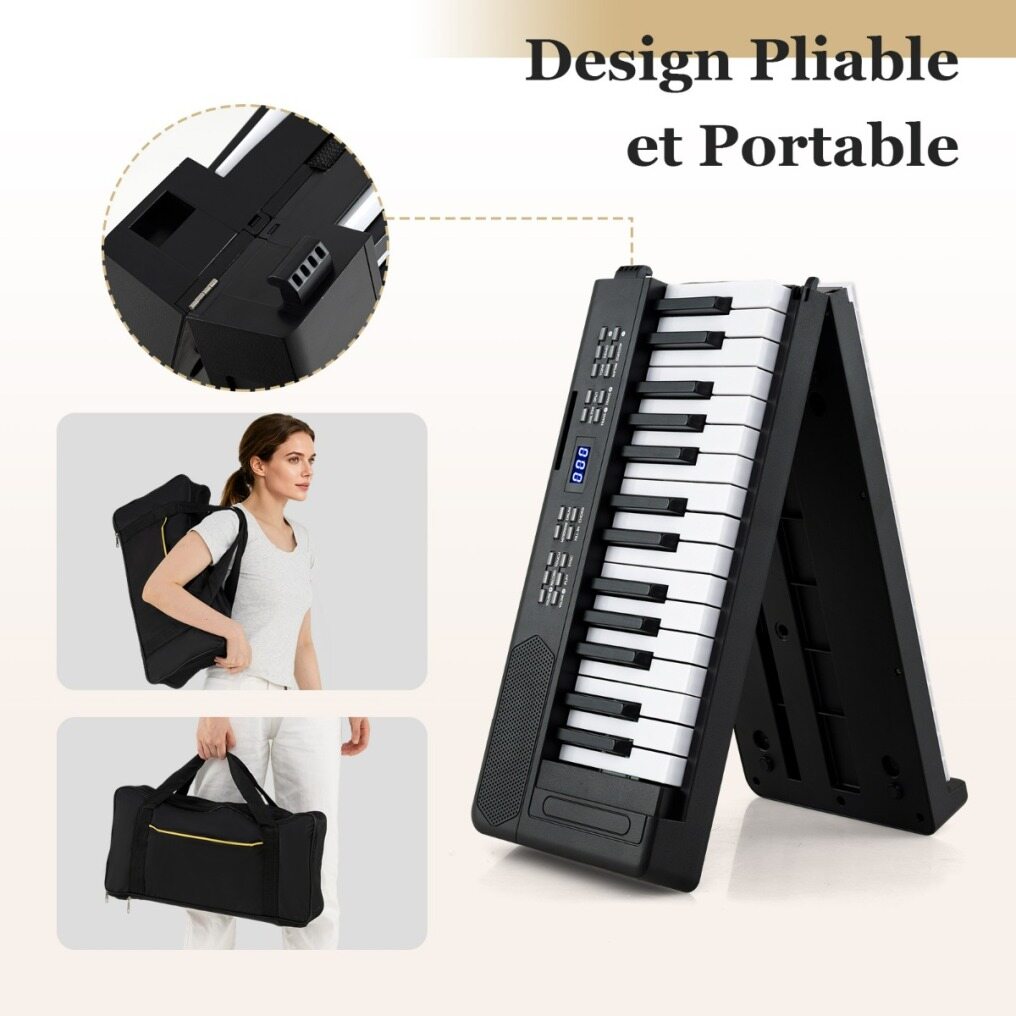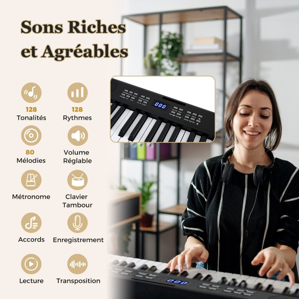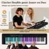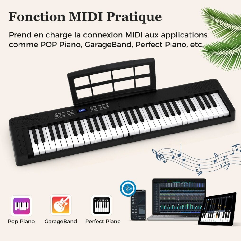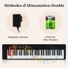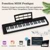 The 61-key folding piano keyboard is the perfect way to explore the world of music! 128 timbres, 128 rhythms, and 80 songs guarantee a delightful listening experience. Chord functions, transposition, a metronome, and a keyboard drum kit offer a wealth of possibilities. The recording function makes music creation easy. The dual keyboard function is ideal for duets. The MIDI function allows connection to learning apps, helping beginners progress on the piano. Various external connections are included: a sustain pedal jack, audio input, microphone jack, audio output, a power switch, and power/MIDI jacks.