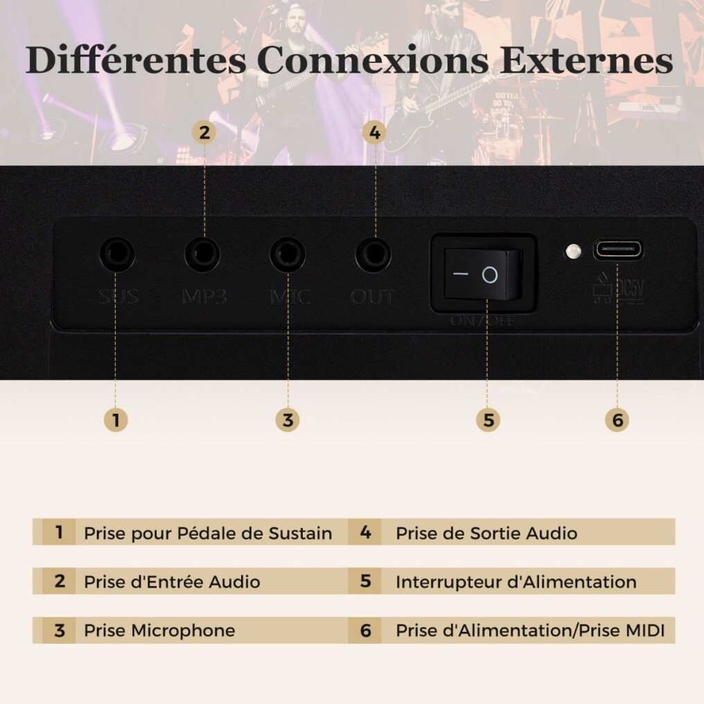 【MIDI & Multiple Connections】The keyboard supports MIDI connection with applications like POP Piano, GarageBand, Perfect Piano, etc., for easy learning. Several jacks located on the back are compatible with sustain pedal, headphones, microphone, and power.