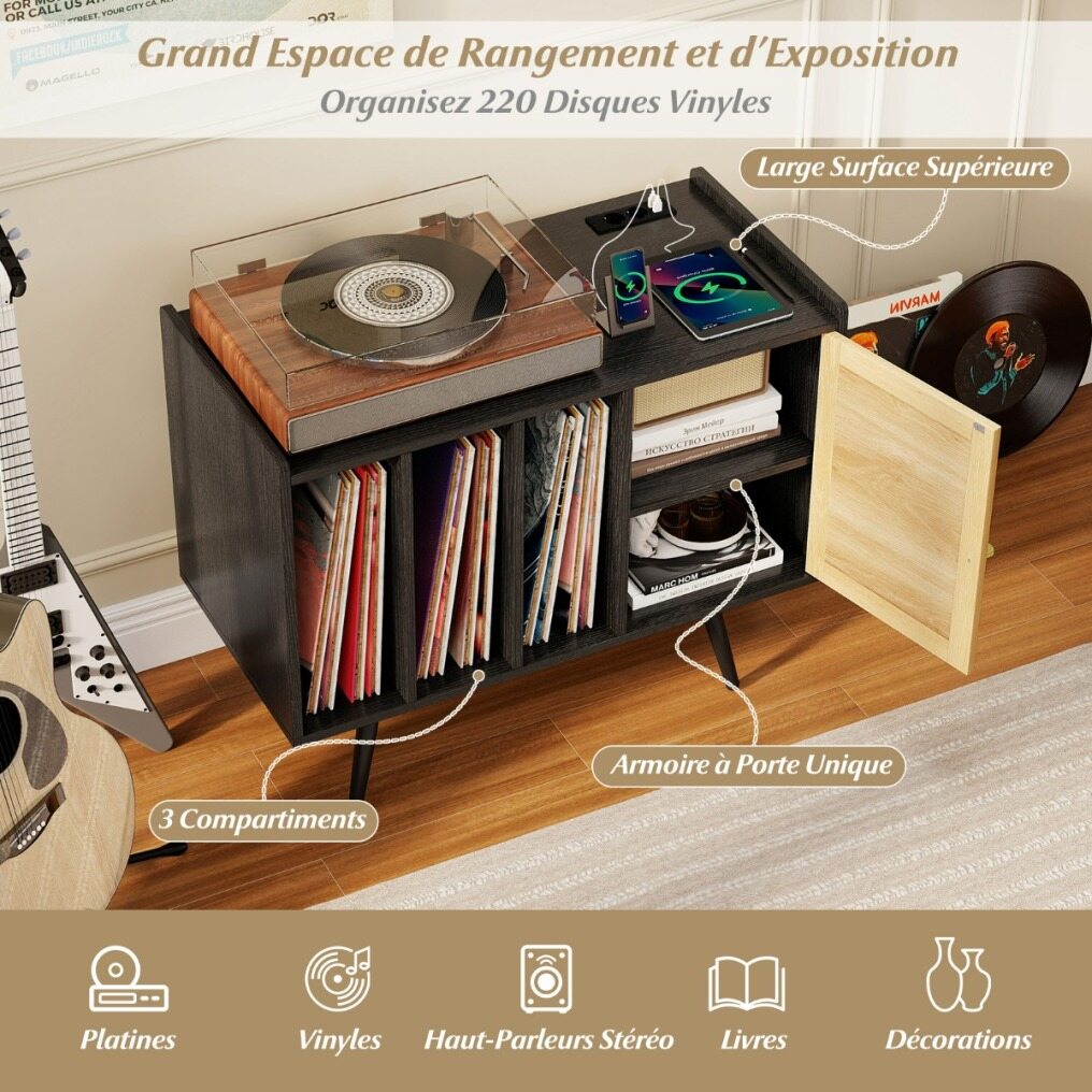 【Convenient Charging Station】This turntable stand is equipped with a built-in charging station (2 AC outlets and 2 USB ports) to charge your devices while listening to your favorite vinyls. For added convenience, the cable management allows you to manage and route cables neatly.