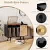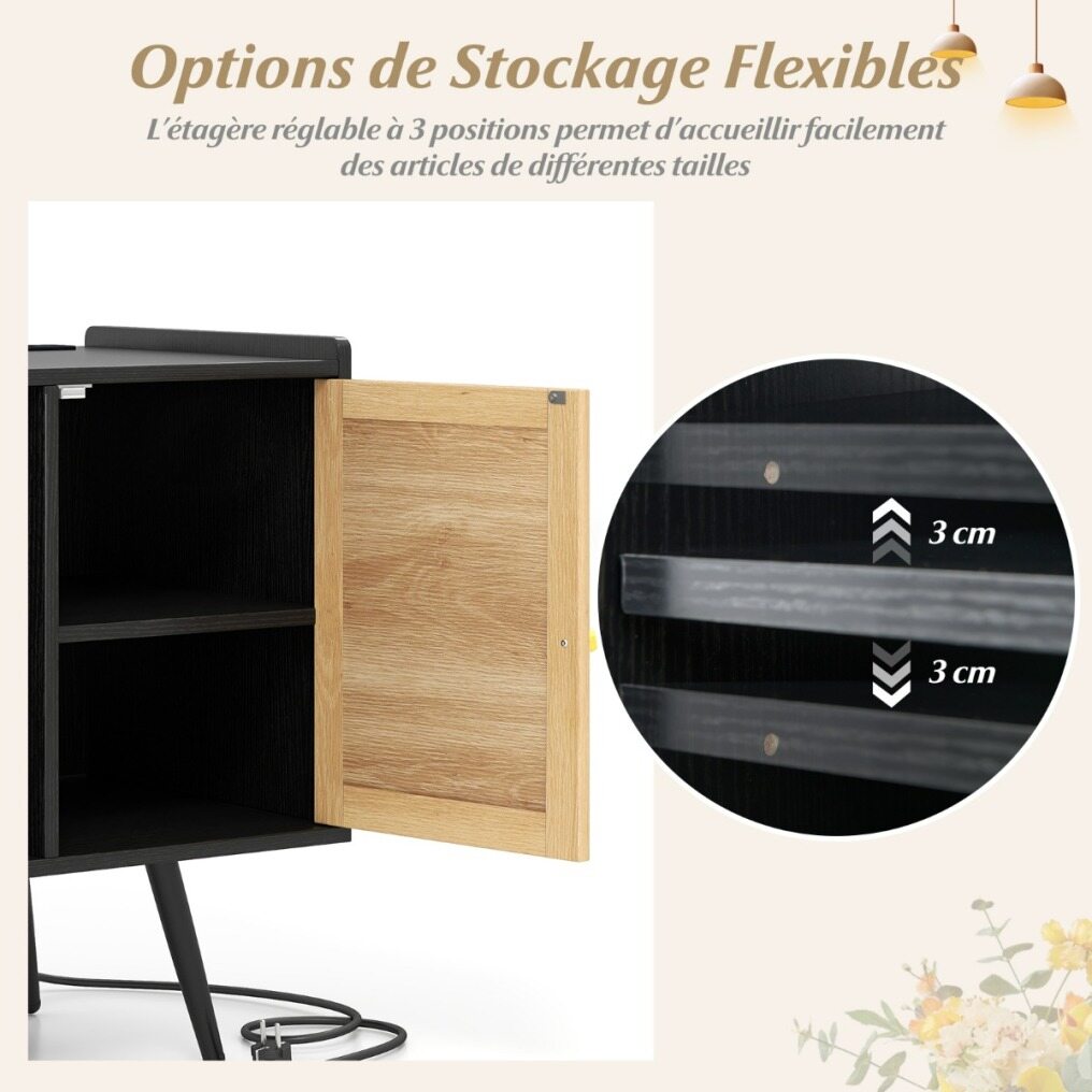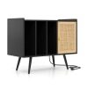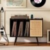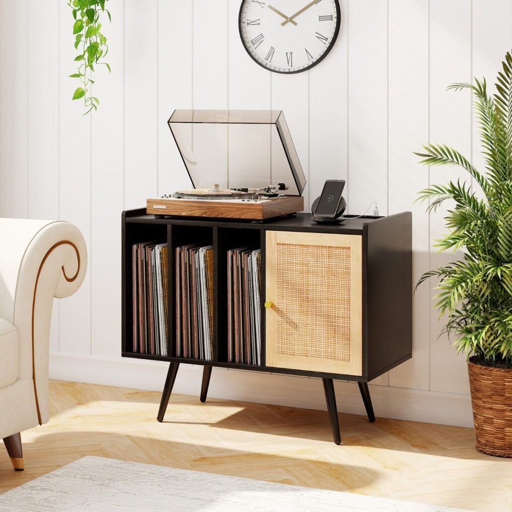 This stand with a power outlet allows you to charge multiple devices simultaneously. The cable management prevents cable clutter. The large top shelf provides ample space for your turntable, and the three open shelves offer convenient storage solutions for your albums. Additionally, the natural charm of the rattan door adds a warm, textured touch to your room, while the adjustable interior shelf offers flexible storage options. For added stability and safety, the turntable stand is supported by angled legs and equipped with an anti-tip system.