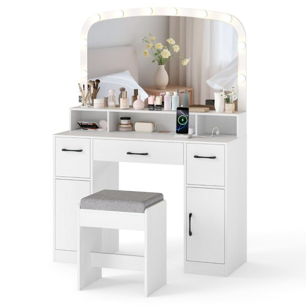 Transform your morning routines with our 108 cm vanity table with mirror and light! This vanity set features a generously sized mirror surrounded by 10 LED bulbs, offering 3 lighting intensities for perfect illumination for every makeup application. Keep your devices charged with the integrated power station, equipped with AC, USB, and Type-C outlets, and a cable management. The storage solution includes open shelves, spacious drawers, and closed cabinets. Designed for safety, it is equipped with anti-tip kits and anti-slip protection. Perfect preparation awaits you with this vanity set!