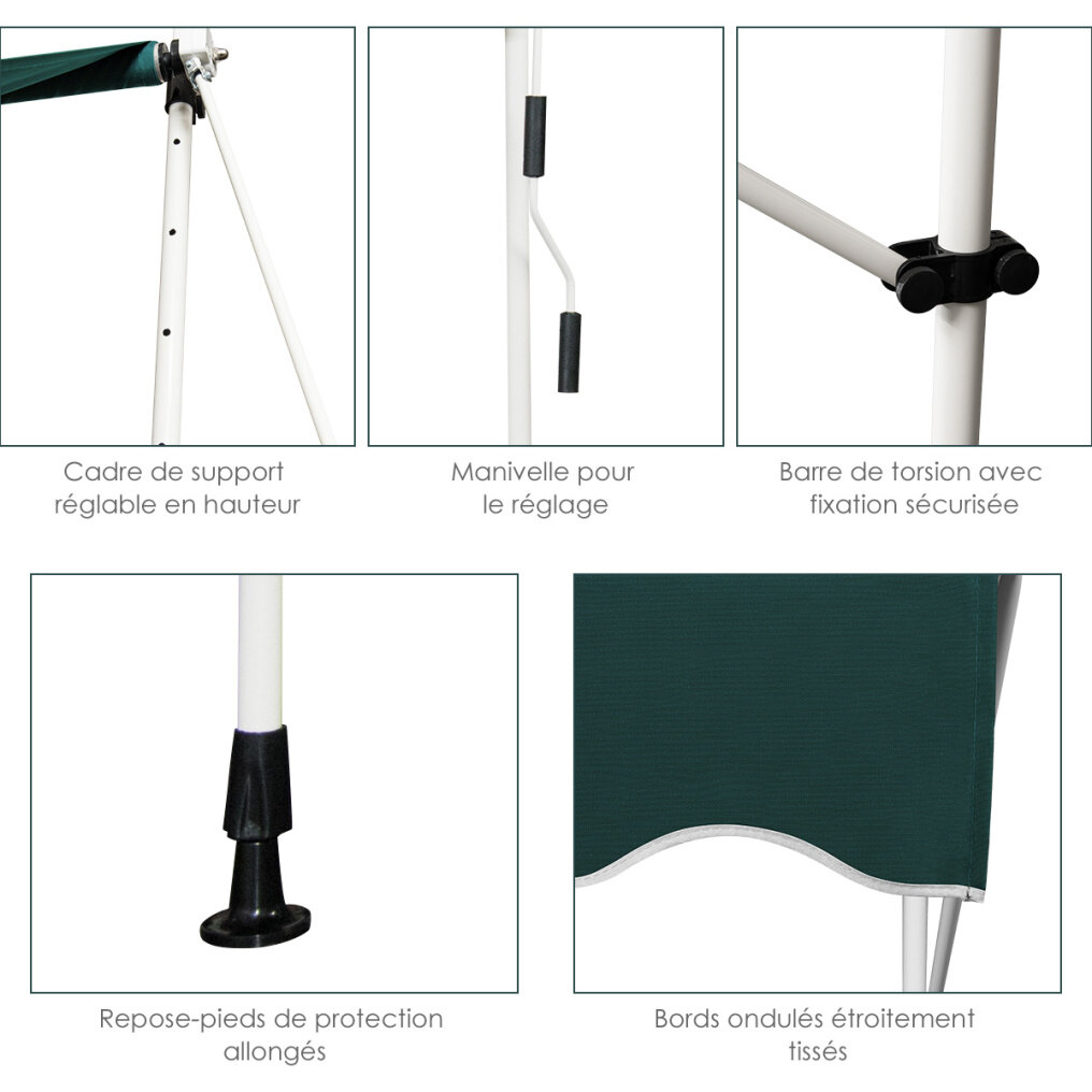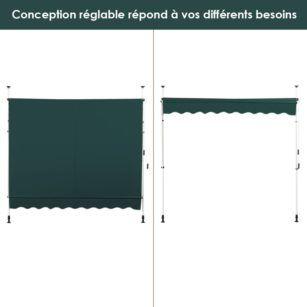 Adjustable Tube and Manual Crank: The height of the aluminum tube can be adjusted between 200 and 300 cm depending on where you place the side knob. With a manual crank, the angle of the telescopic awning can be adjusted according to your needs. It protects you very well from the sun in any position.