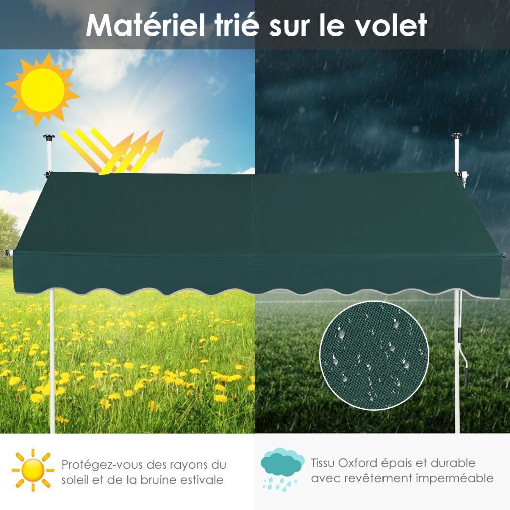 It is made of high-quality Oxford fabric with PU coating and is weatherproof. With a lightweight design and solid aluminum frame, the awning is stable and sturdy and can also withstand wind. With a manual crank, the awning is retractable and you can adjust the height and angle. This awning reduces harsh glare and allows you to have a cool and soft light environment. It is the perfect choice for outdoor spaces and is easy to use manually.