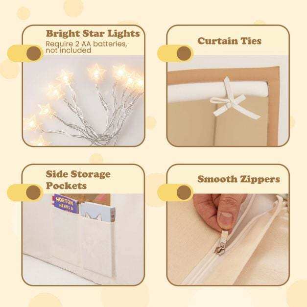 【Thoughtful Features】Four windows ensure good ventilation. Two side pockets allow children to store their belongings, such as books, snacks, toys, etc. In addition, the tent is equipped with luminous stars to create a magical and dreamlike atmosphere.
