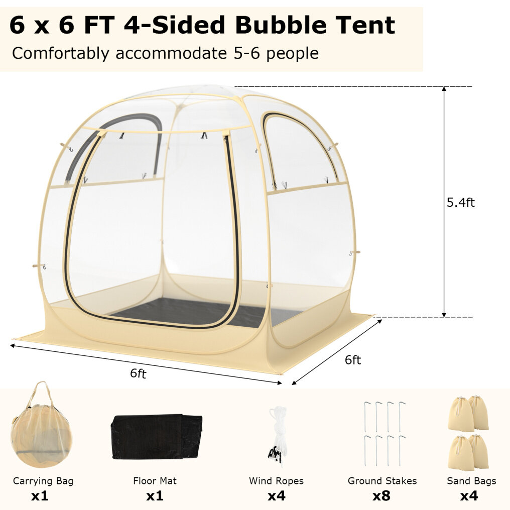 ● Enhanced Stability: The 6 x 6 ft/4.2 x 4.2 ft 4-side bubble tent comes with metal ground stakes to fix 4 corners of the tent and secure wind ropes, providing excellent stability even in windy conditions. Additionally, there are 4 sandbags that could be weighted down with stones or sand.