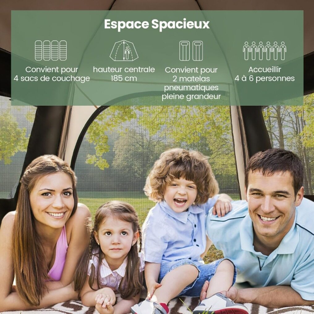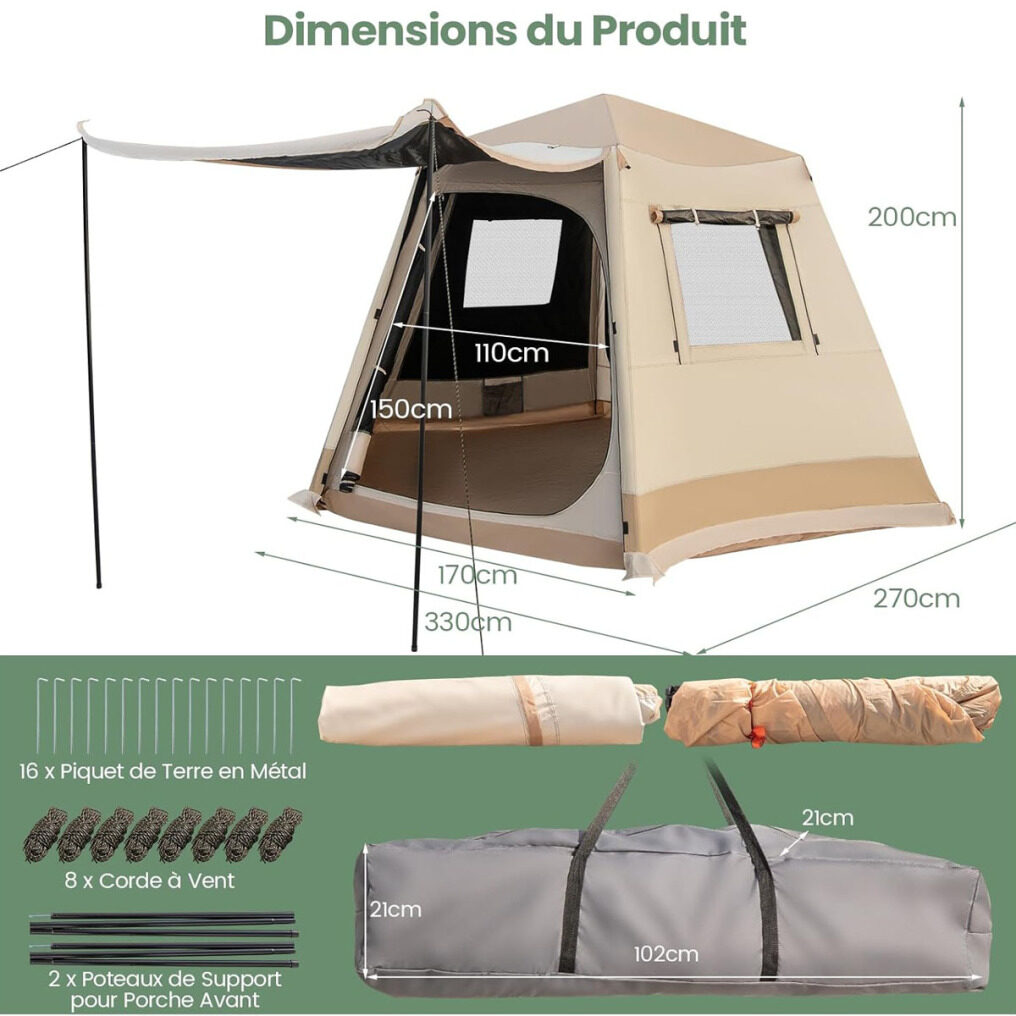 【Spacious Space & Large Front Sunshade】This large family tent measures 330 x 270 x 200 cm (L x W x H) and its internal center height is 185 cm, providing generous space to comfortably accommodate 4 to 6 people. In addition, its large front sunshade allows you to set up tables and chairs to enjoy pleasant camping moments with family or friends.