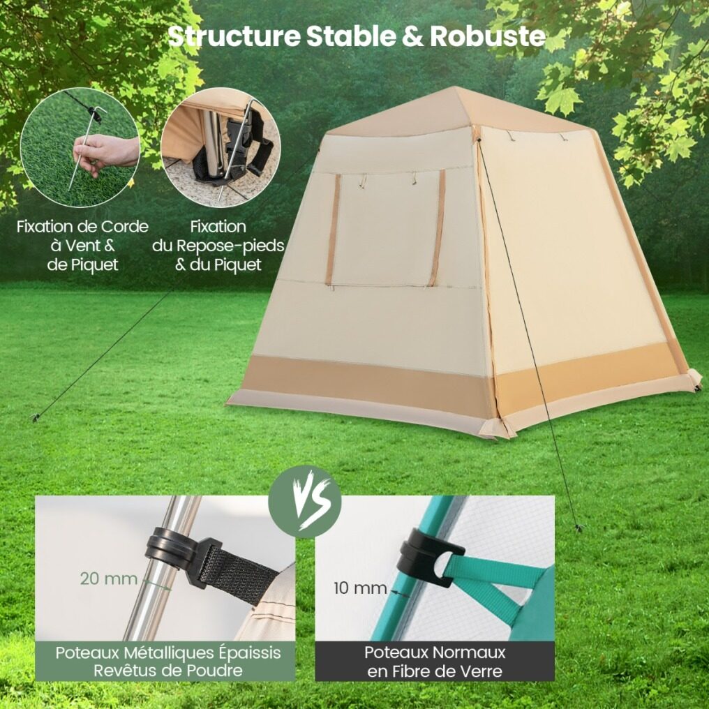 【Stable and Sturdy Structure】The double layer cabin tent is supported by 20mm thick powder-coated poles, providing increased durability and stability compared to conventional 10mm fiberglass poles. In addition, it is equipped with a wind rope and a fixing peg, ensuring a solid and secure structure.