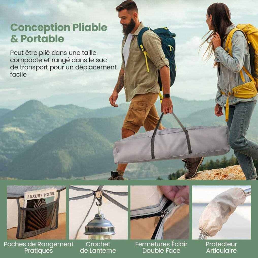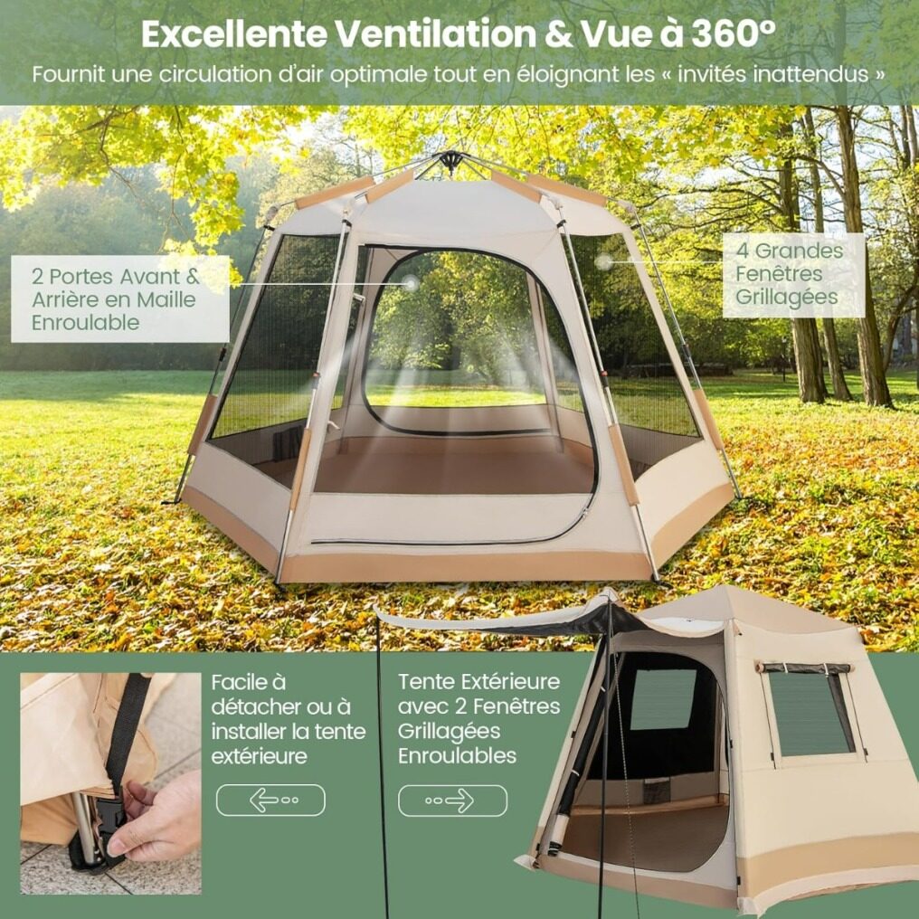 【Excellent Ventilation & 360° View】The inner tent features 4 large mesh windows and 2 roll-up mesh front and rear doors, ensuring optimal air circulation while keeping unexpected visitors away. You can also fully immerse yourself in the beauty of the surrounding nature thanks to the 360° view.