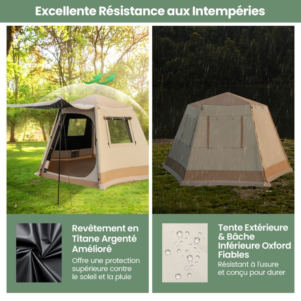 【Excellent Weather Resistance】The outer tent and bottom tarp are made of wear-resistant and tear-resistant Oxford fabric, ensuring long-lasting outdoor use. The fabric surface with upgraded titanium silver coating provides superior sun protection and rain resistance, keeping you dry and protected.