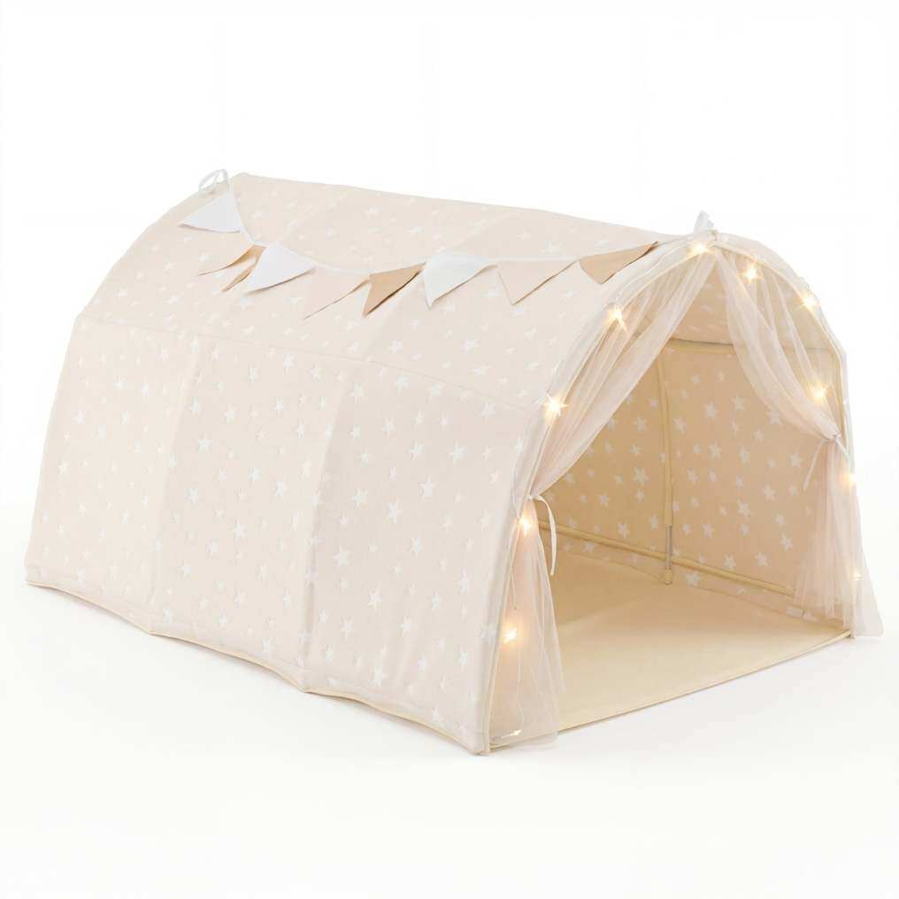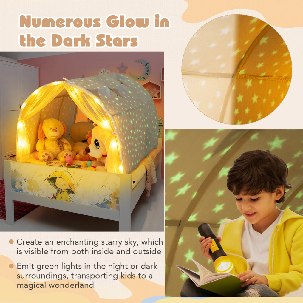 Looking for a gift to spark your child's imagination? This 2-in-1 bed tent is a unique bed canopy that makes bedtime exciting. This children's bed shelter serves a dual purpose: a play area during the day and a cozy sleeping space at night. Designed for single beds, this tent provides a safe and comfortable sleeping space for your child. Even better, the starry patterns on the tent emit a green light at night or in the dark, transporting children to a magical world. Additionally, the mesh curtains at the front and back ensure good ventilation while keeping unwanted visitors out. Complete with star-shaped string lights and a bunting banner, this magical play tent exudes charm and sweetness, transforming any room into a fairytale paradise.