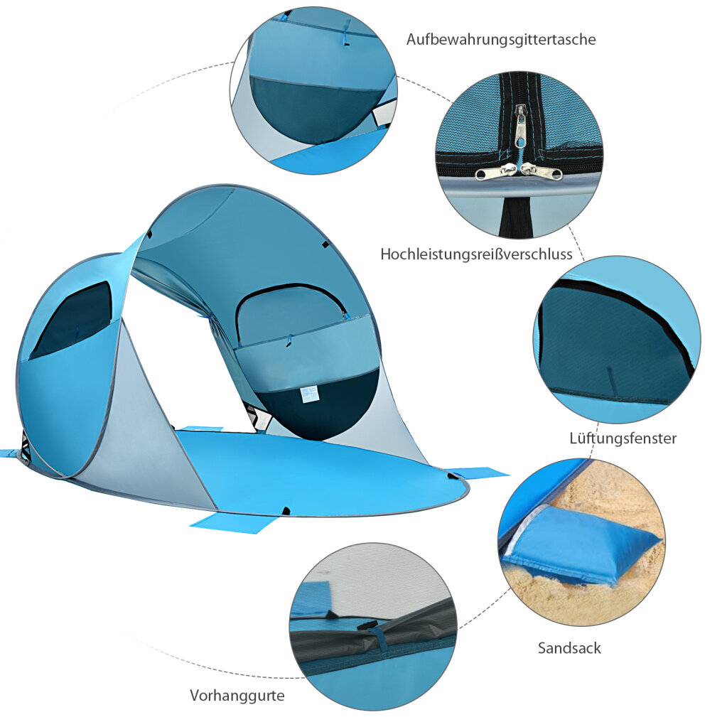 Ideal for outdoor activities: This practical tent protects you from the dangerous rays of the sun on the beach or in the garden, making it perfect for picnics, camping or barbecuing. The two mesh pockets under the windows provide space for small items.