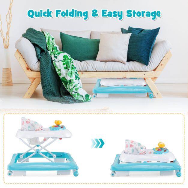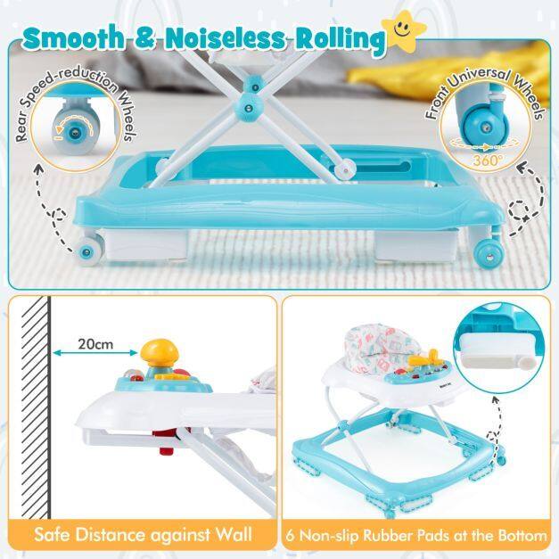 Foldable & Portable Design: This baby walker is foldable, making it space-saving for storage and transport. Simply fold it up and put it in the car trunk or store it in the corner or under the bed when it's not in use. It's the perfect solution for busy parents on the move.
