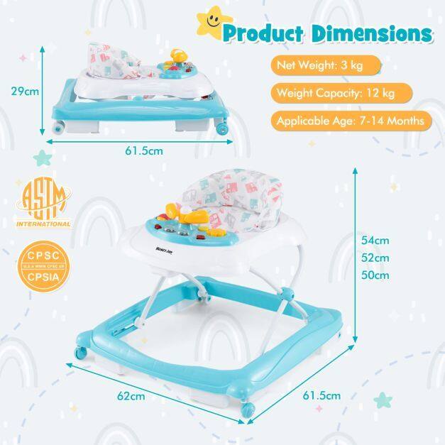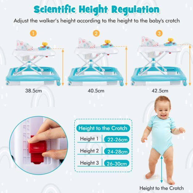 3-Level Adjustable Height: This foldable baby walker features 3 adjustable height positions to offer the optimal height for growing kids. Whether your baby is just starting to take those first steps or is already cruising around, you can easily adapt the walker to suit their needs and provide optimal support.