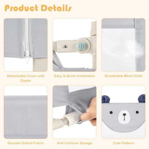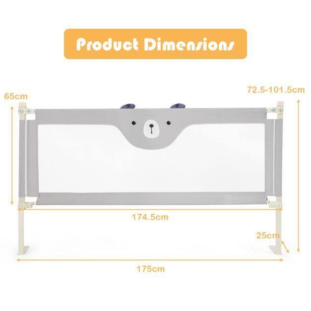 This 69” bedrail fits a variety of bed sizes and you can choose to buy 1-4 pieces as you need. It provides you with multiple adjustable heights to meet different mattress as well as offering ample protection for your baby. If you want to care for them, you can easily put down one side, which is convenient and avoids bending over frequently. Meanwhile, it adopts double safety lock to prevent baby’s careless operation. Your baby will surely feel comfortable being surrounded by the rail, which is made of breathable and safe material. If you need such a wonderful baby protector, don’t hesitate to order it right now!